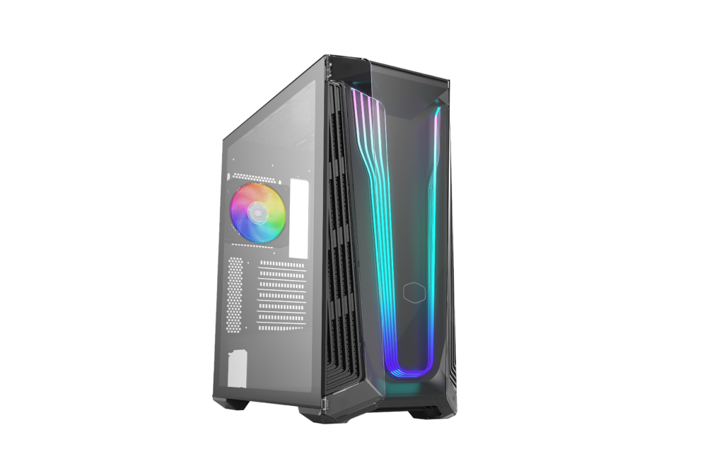 Die MasterBox 540 verfügt über eine „Ether“-Frontplatte und bietet anpassbare ARGB-Streifen, die hinter einer transparenten Platte strahlen.
