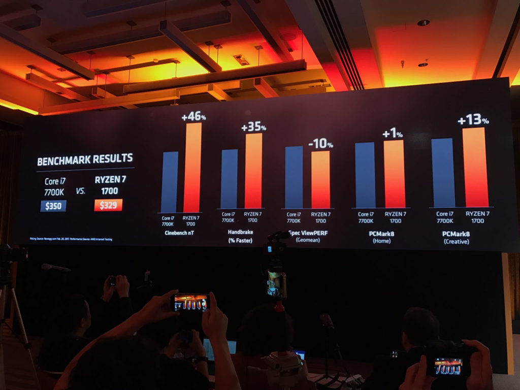 AMD ist sehr zuversichtlich, die eigene Desktoplinie im Vergleich zu Intels Top-Prozessoren Konkurrenzfähig zu halten. In der jüngsten Ryzen Launch-Präsentation, veröffentlichte das Unternehmen Benchmark-Ergebnisse, welche darstellen, dass die 499 € Ryzen 7-1800X mit dem 1.099 € Core i7-6900K, trotz eines schmaleren Speicher-Bus und weniger als die Hälfte seines Preises gleichzieht. Interessanterweise behauptet das Unternehmen, dass der Ryzen 7-1700, das drittschnellste Ryzen-Modell, ein klarer Gewinner gegen den preiswerten Core i7-7700K ($ 329) sein wird. Der Ryzen 7-1700 generiert eine bis zu 46% höhere Leistung als der i7-7700K und hält sogar eine schlanke Führung gegenüber seinem Konkurrenten bei Tests mit geringen Multi-Threading-Anwendungen.