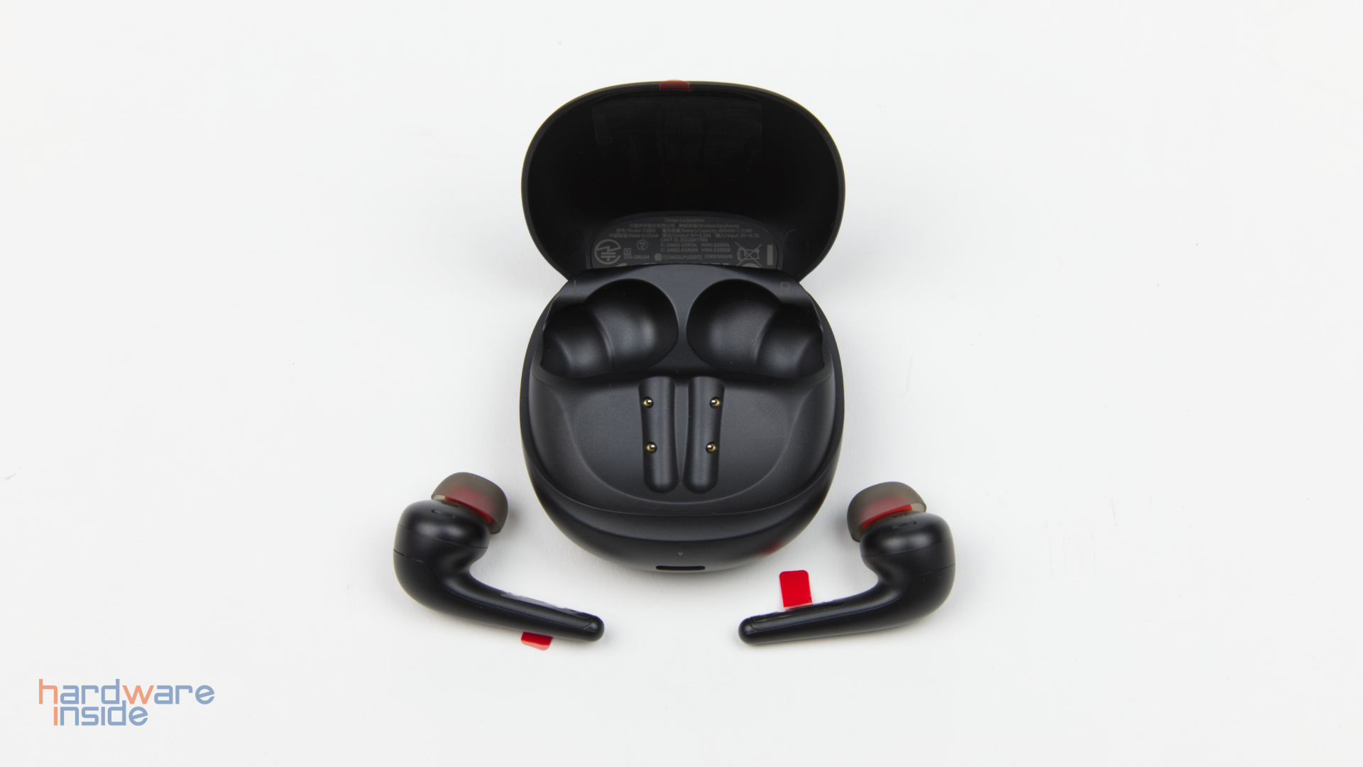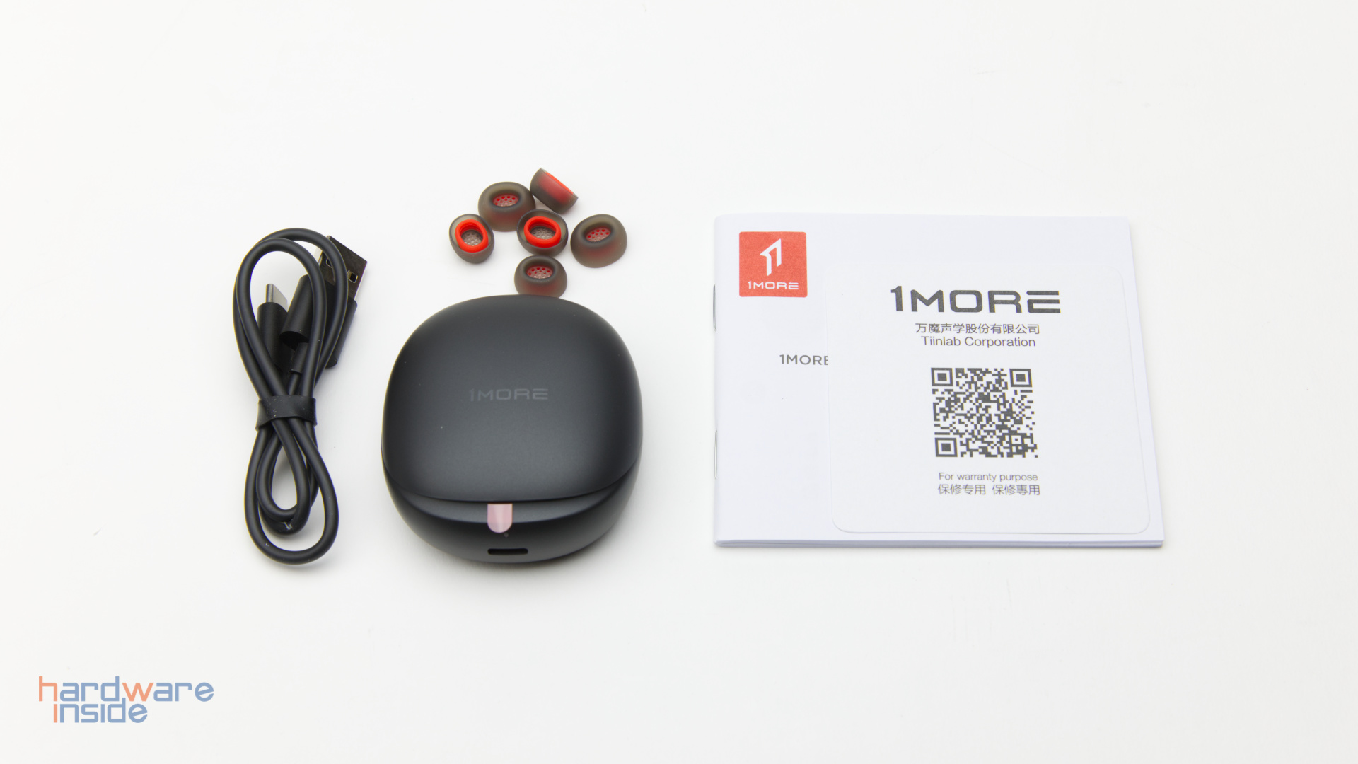 Neben den 1More Aero lässt sich der auch sonst für den Hersteller übliche Lieferumfang finden. Das wären ein USB-C auf USB-A-Kabel zum Aufladen der Ladeschale, drei Sätze an Ohrstücken aus Silikon in unterschiedlicher Größe sowie das obligatorische Handbuch. Ein mit QR-Code versehener Zettel bietet Informationen darüber, ob es sich um ein echtes Produkt oder eine Fälschung handelt.
