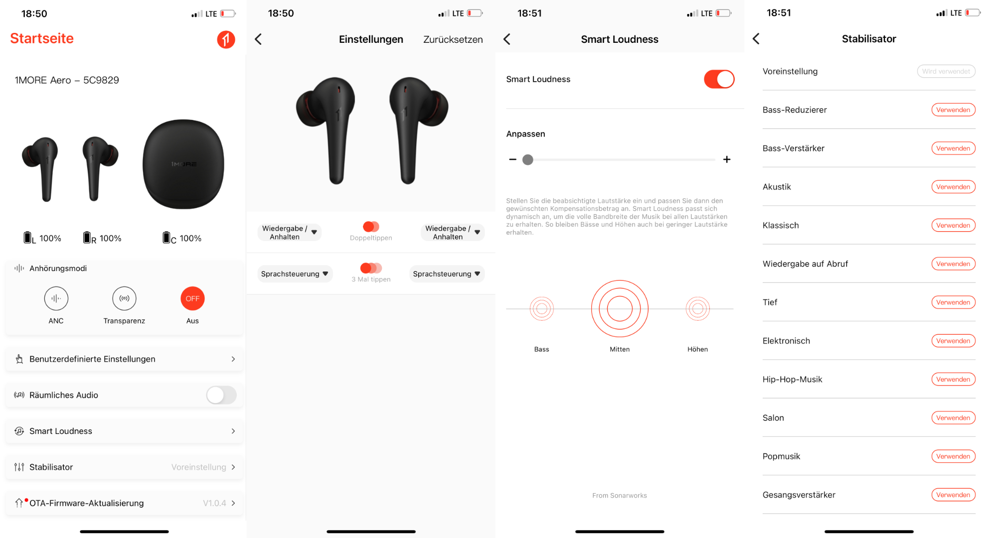 Die Kopfhörer halten sicher in der Ladeschale über die integrierten Magnete. In den Aero sind Infrarot-Sensoren verbaut, die ein automatisches Pausieren von Musik ermöglichen, wenn einer der Hörer aus dem Ohr entnommen wird. Die Bedienung findet über die in den Hälsen eingelassene Sensorik per Touch statt. Doppelt tippen auf einen der Kopfhörer startet die Sound-Wiedergabe oder pausiert diese. Anrufe können ebenfalls mit doppelt tippen angenommen und aufgelegt werden. Drei mal tippen aktiviert die Sprachsteuerung, da wir iOS nutzen, wird Siri eingeschalten. Bei 1,5-sekündigem gedrückt halten einer der beiden Seiten, wird zwischen den Hörmodi gewechselt. Diese sind „Off, Transparenz und ANC. ANC wiederum kann in der App in vier Stufen variabel eingestellt werden – Stark, Schwach, WNR und Adaptiv.