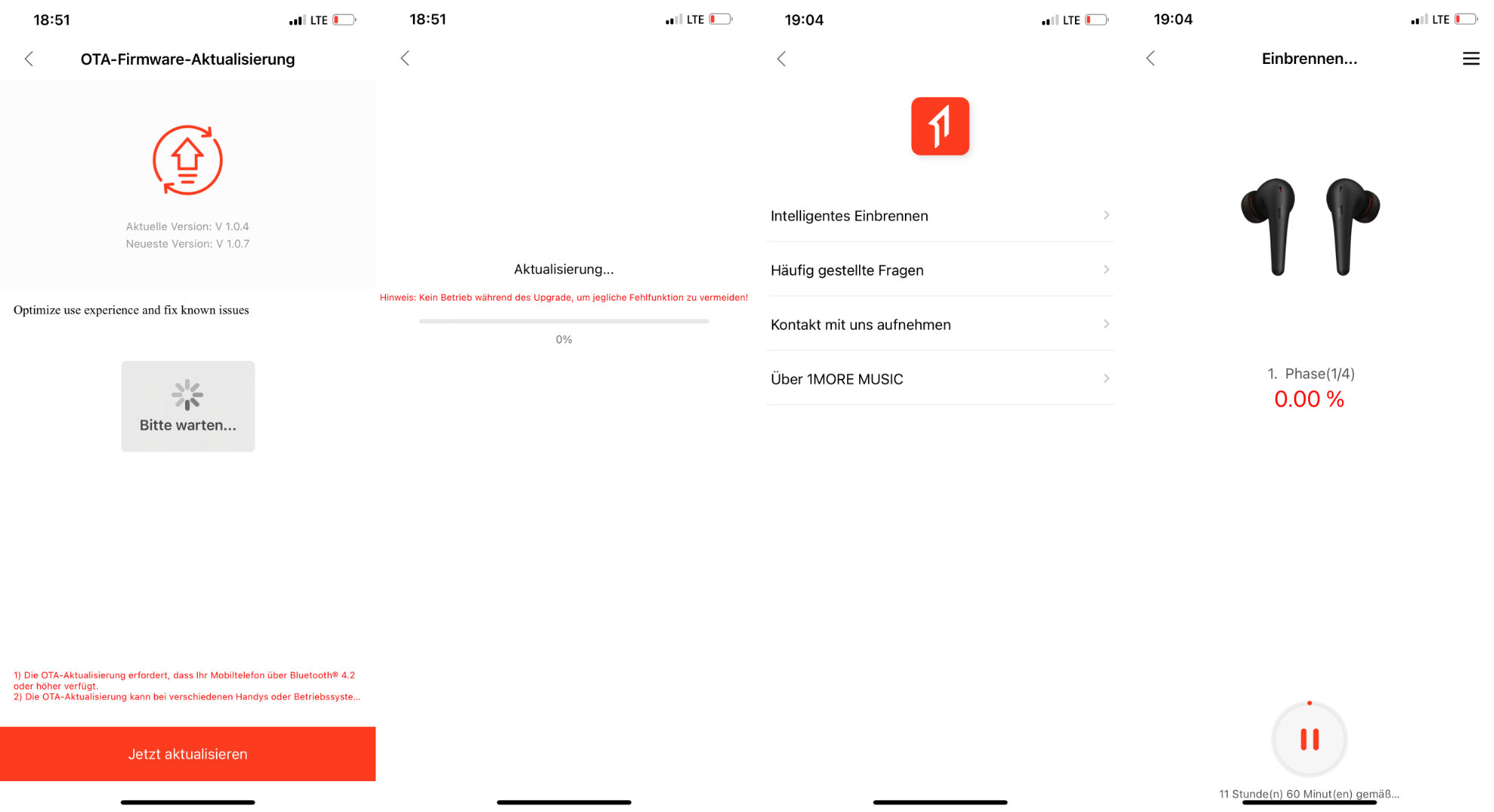 Die App „1More Music“ gibt es sowohl für iOS als auch Android. Die Oberfläche ist übersichtlich gestaltet und lässt sich dadurch leicht bedienen. Ganz unten findet sich eine Einführung zu den 1More Aero, welche alle Fragen mithilfe einer Animation beantworten sollte. Der Anfang besteht, wie von 1More gewohnt, aus der richtigen Wahl der Ohrstöpsel (schwarz oder weiß). Bevor wir die Aero aber unseren Praxistests unterziehen, führen wir ein Firmware-Update durch. Dieses wird mit einem Klick angestoßen und ist nach wenigen Minuten abgeschlossen. Danach lassen wir spaßeshalber unsere In-Ears einbrennen, was einen besseren Klang zur Folge haben soll.