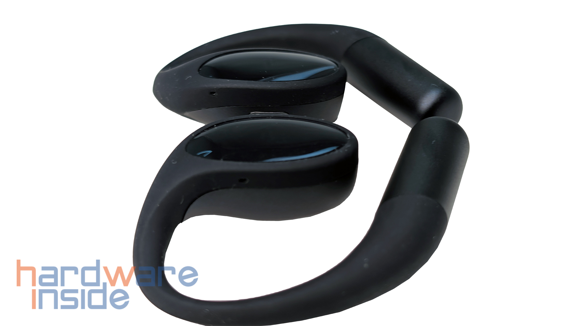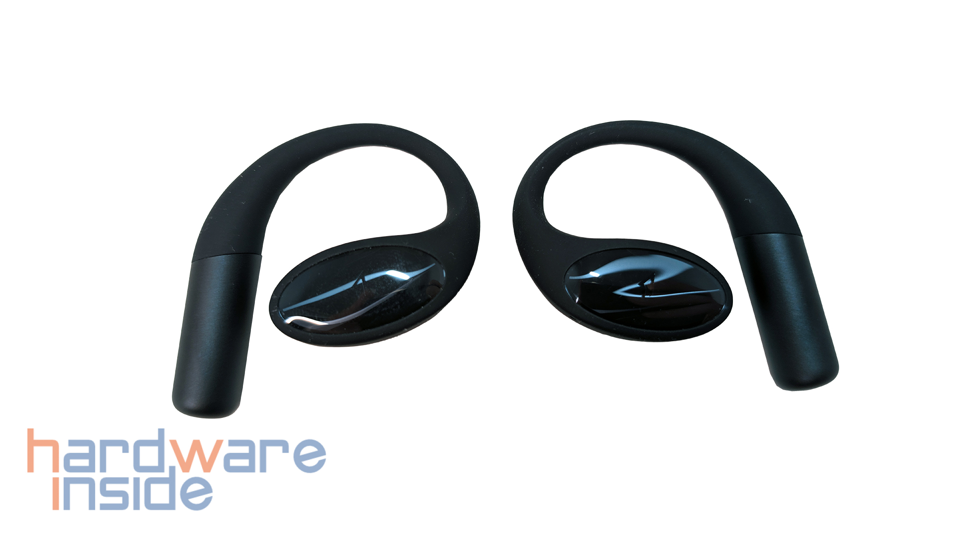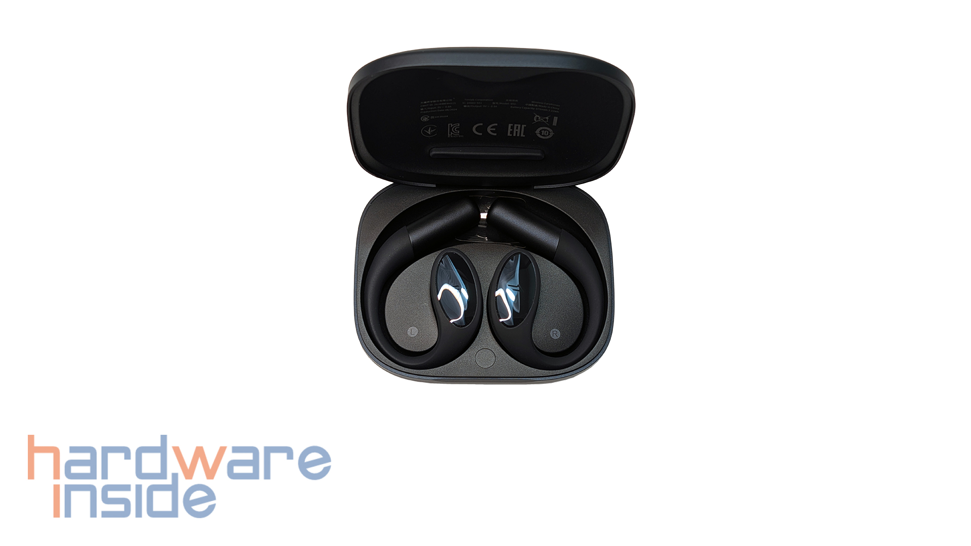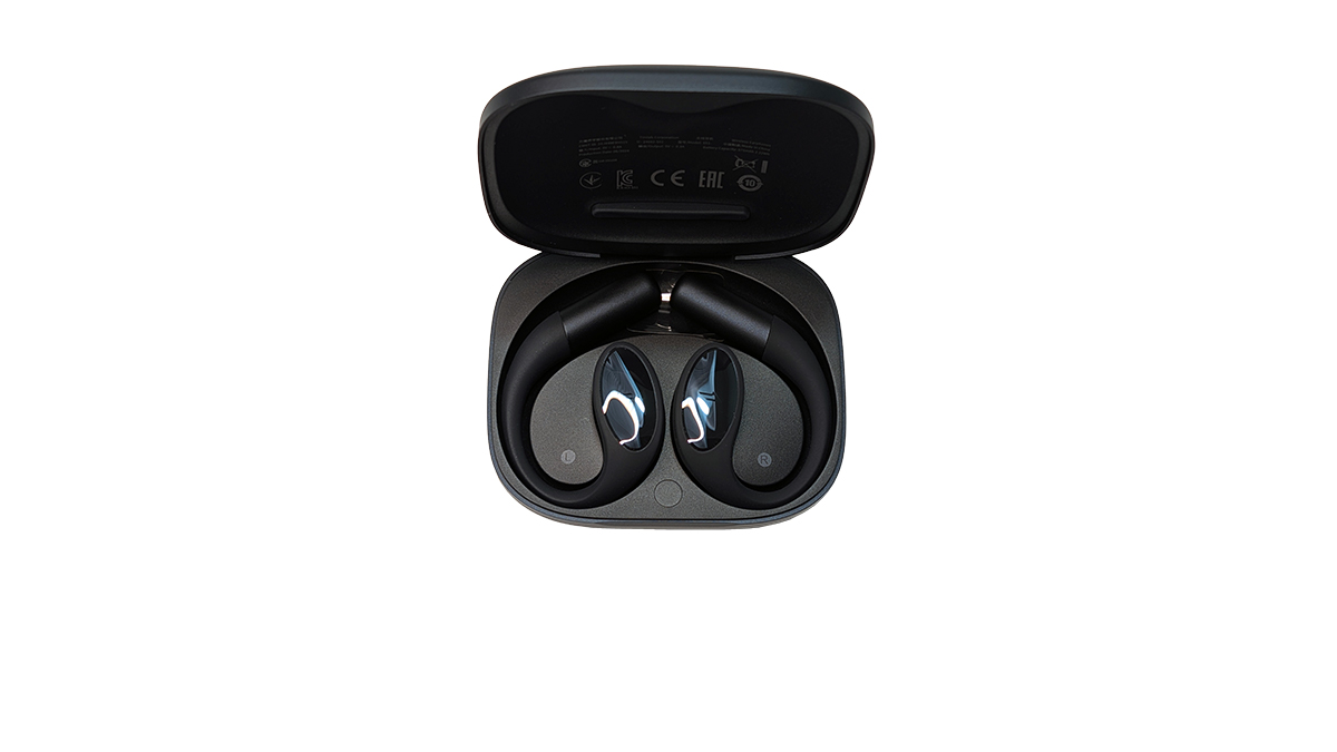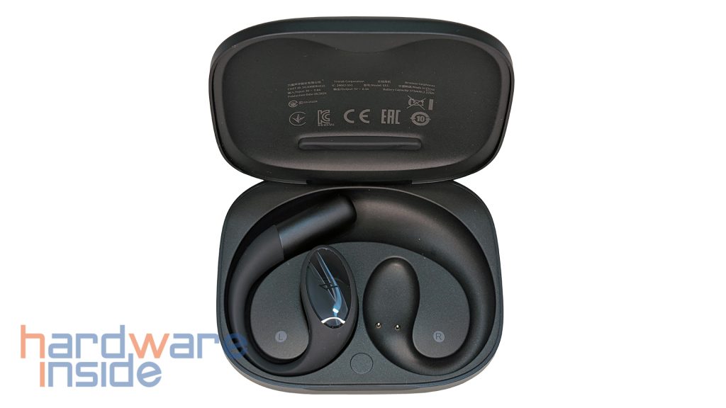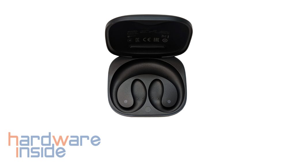 Das Innere ist so geformt, dass die beiden Open-Earbuds gut geschützt transportiert werden können. Magnete halten die Hörer an ihrem Platz. Über die Kontakte auf jeder Seite werden die Earbuds aufgeladen. An der unteren Kante befindet sich eine runde Taste, mit der die Earbuds erneut in den Pairing-Modus gebracht werden können. Damit die Seiten nicht verwechselt werden können, sind hier auch die Kennzeichnungen L und R vorhanden.