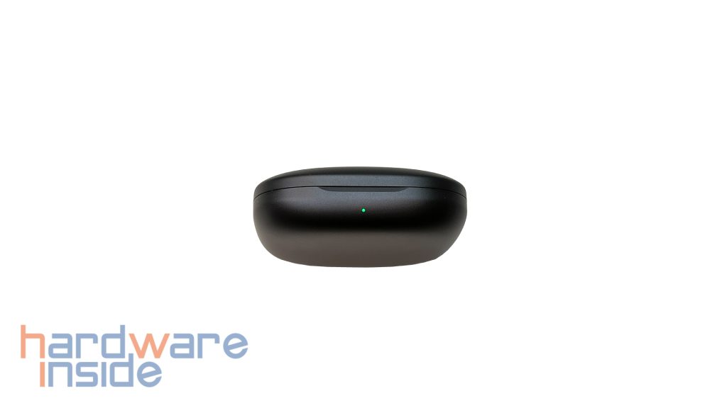 Passend zur Optik der Earbuds besteht das ovale Ladecase aus schwarzem Kunststoff. Auf der Vorderseite befindet sich eine kleine LED, die den aktuellen Ladestatus des Cases anzeigt. Dabei wird zwischen den Farben Grün, Orange und Rot unterschieden. Auf der Rückseite ist eine USB-C-Buchse eingelassen, über die der interne Akku geladen werden kann. Dadurch wird eine Gesamtlaufzeit von bis zu 40 Stunden erreicht.
