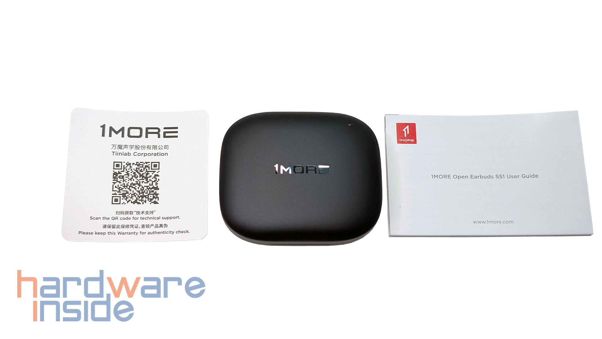 Neben den beiden Open-Earbuds, die sicher im Ladecase verstaut sind, finden wir im Lieferumfang noch eine Bedienungsanleitung und einen QR-Code, der auf die Webseite verlinkt.