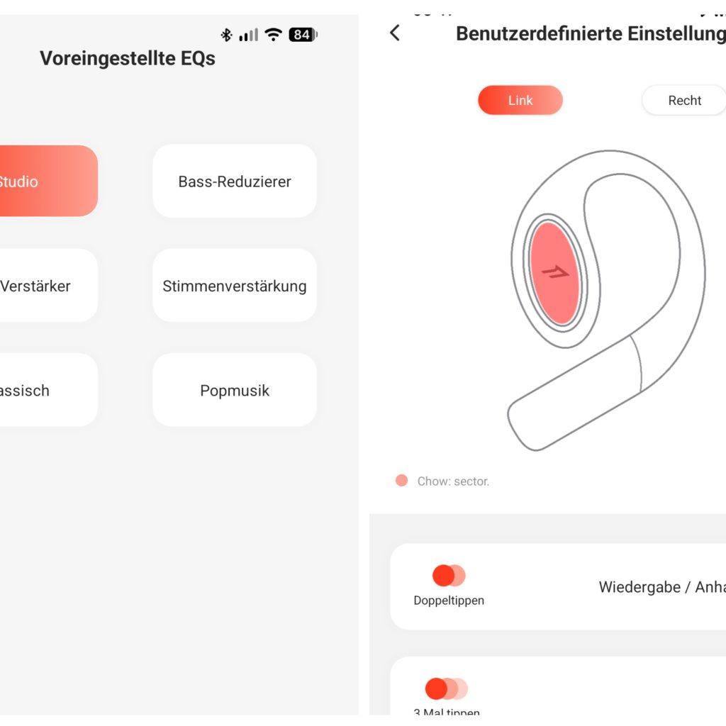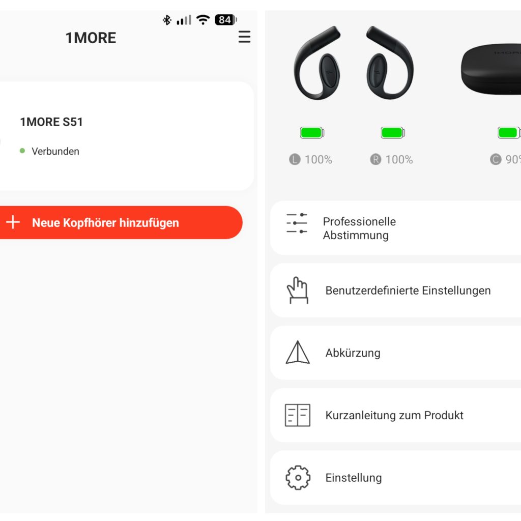 Für den Betrieb der Open Earbuds S51 wird grundsätzlich keine App benötigt. Um jedoch den vollen Funktionsumfang nutzen zu können, sollte die 1MORE-App auf das Smartphone heruntergeladen werden. Die Anwendung ist für iOS und Android verfügbar und kann im jeweiligen App-Store heruntergeladen werden. Über die App lassen sich vordefinierte Equalizer auswählen, die Touch-Steuerung konfigurieren, die Latenz verringern, die Kurzanleitung anzeigen sowie globale Einstellungen und Firmware-Updates durchführen. Etwas verwirrend ist allerdings die teils holprige deutsche Übersetzung, die Existenz von zwei Apps und die Tatsache, dass sich die Touch-Kürzel nicht vollständig individuell anpassen lassen.