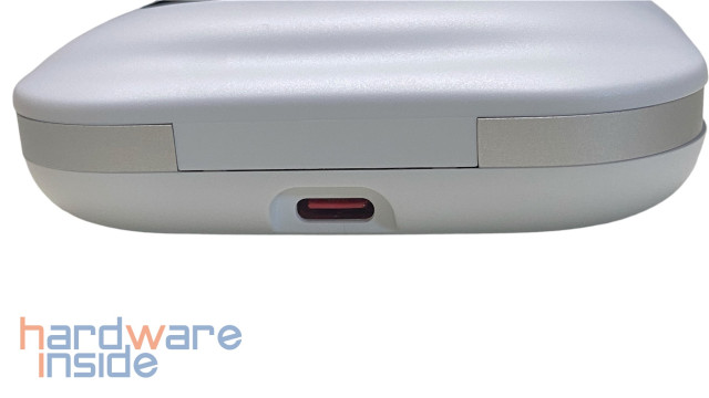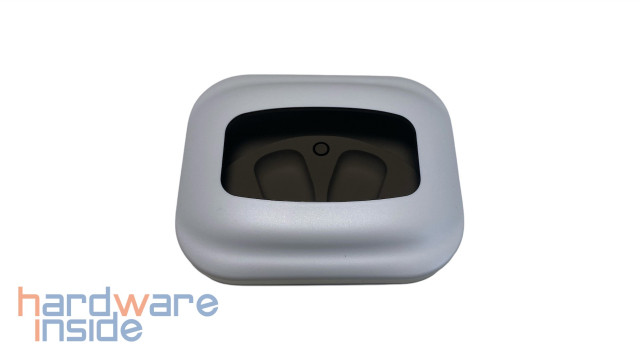 Das Innere ist so geformt, das die beiden Open Earbuds gut geschützt transportiert werden können. Magnete halten die beiden Hörer an ihrem Platz. Über die beiden Kontakte auf jeder Seite werden die Earbuds aufgeladen. Ungefähr in der Mitte ist ein Ring zu sehen, hinter diesem ist eine grüne Status-LED verbaut. An der unteren Kante ist eine graue runde Taste zu sehen, damit können die Earbuds erneut in den Pairing-Mode gebracht werden. Damit die Seiten auch nicht verwechselt werden können, ist hier auch eine L- und R-Kennzeichnung vorhanden.