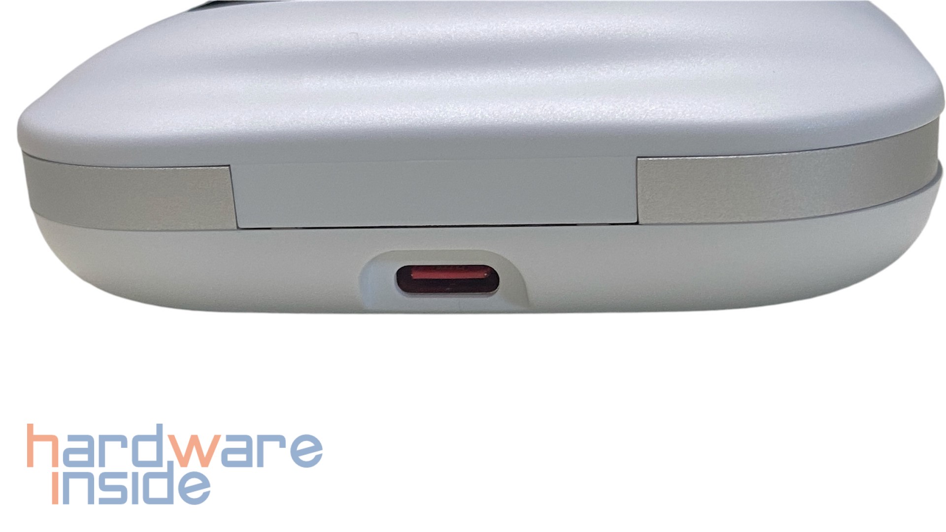 Das ovale Ladecase besteht passend zur Optik der Open Earbuds aus weißem Kunststoff. Im Deckel ist ein Sichtfenster aus getöntem Plexiglas eingelassen. Eine silberne Zierleiste verläuft mittig um das Gehäuse. An der Rückseite ist eine USB-C-Buchse eingelassen, über die der intern verbaute Akku geladen werden kann. Dieser bietet eine weitere 28 Stunden Akkulaufzeit.