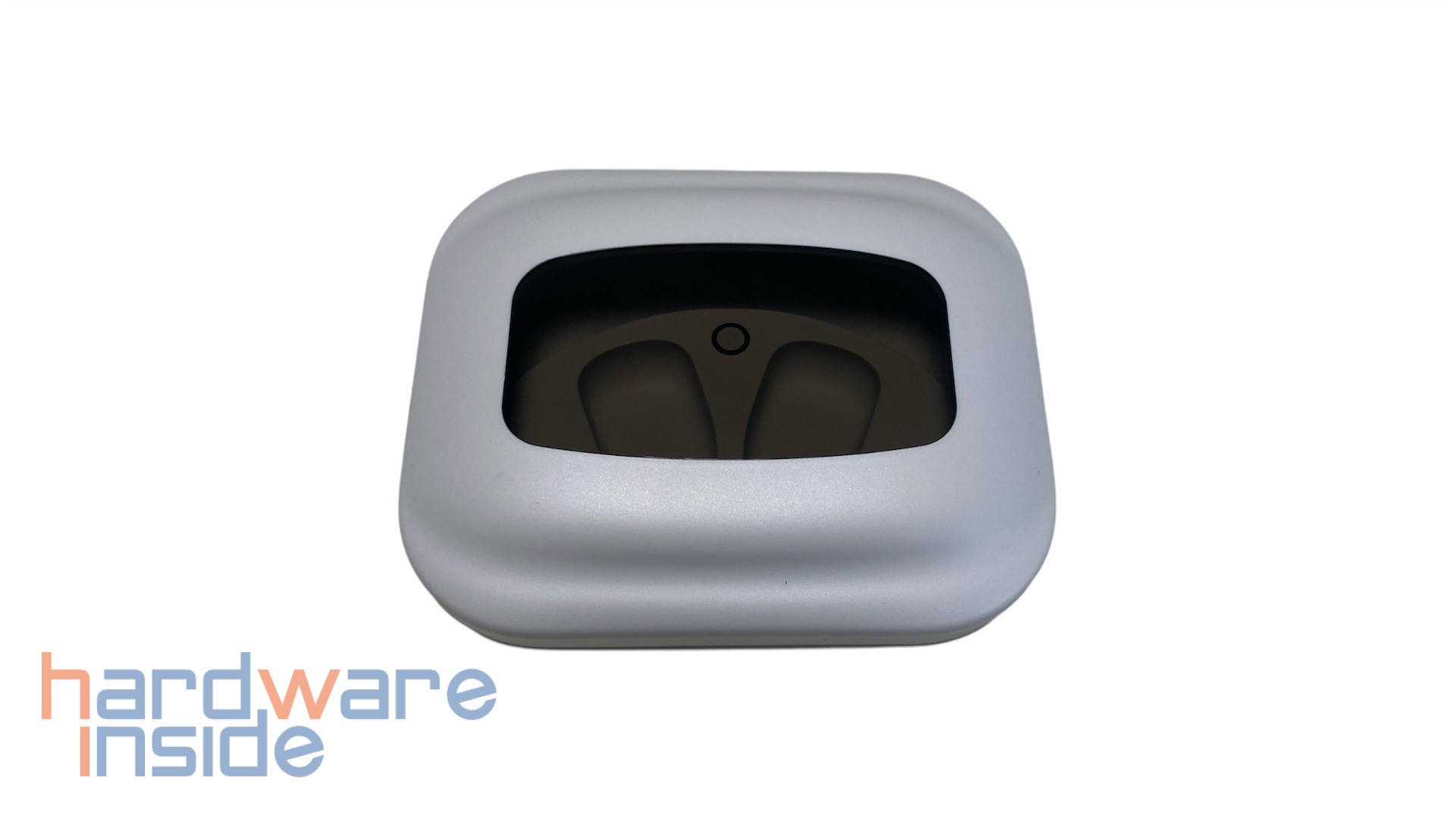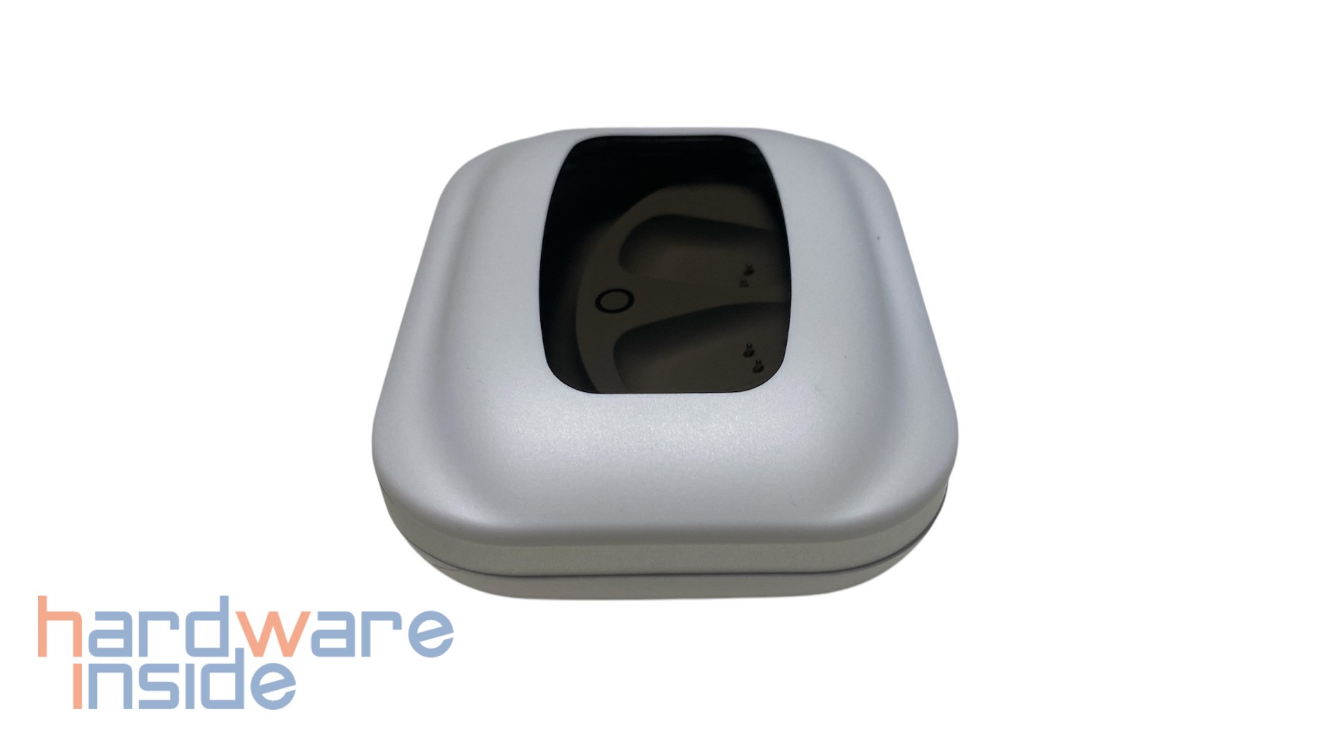 Das Innere ist so geformt, das die beiden Open Earbuds gut geschützt transportiert werden können. Magnete halten die beiden Hörer an ihrem Platz. Über die beiden Kontakte auf jeder Seite werden die Earbuds aufgeladen. Ungefähr in der Mitte ist ein Ring zu sehen, hinter diesem ist eine grüne Status-LED verbaut. An der unteren Kante ist eine graue runde Taste zu sehen, damit können die Earbuds erneut in den Pairing-Mode gebracht werden. Damit die Seiten auch nicht verwechselt werden können, ist hier auch eine L- und R-Kennzeichnung vorhanden.