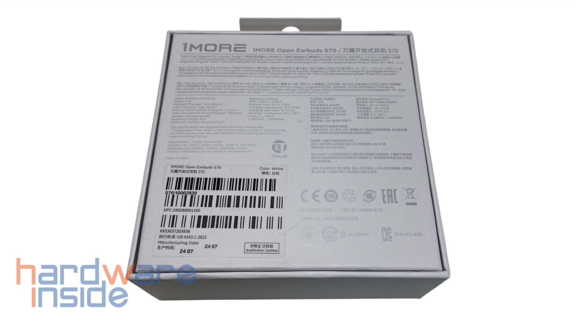 1MORE liefert die Open Earbuds S70 in einem kleinen quadratischen weißen Karton mit einem silbergrauen Akzent in Form einer eins auf der Front, auf dessen rechter Vorderseite zwei Produktabbildungen zu sehen sind. Auch das Herstellerlogo, die Produktbezeichnung sowie einige Features werden hier in silberner Schrift benannt. Rückseitig sind weitere Informationen, die technischen Daten in englischer und chinesischer Schrift aufgedruckt. Ein Aufkleber in der linken unteren Ecke gibt Auskunft über den UPC-Code, die Seriennummer sowie die Farbe. Die Linke Außenseite zeigt mit fünf Symbolen die wichtigsten Features, darunter befindet sich eine Erklärung in Englisch und Chinesisch sowie der Hinweis auf die Bluetooth-Konnektivität.