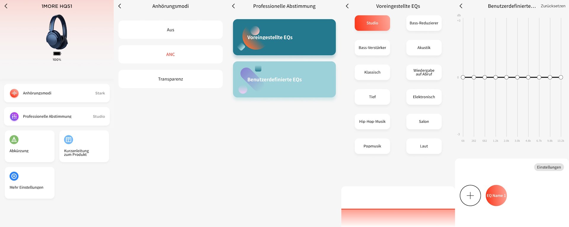 Die 1MORE App bietet uns zuerst eine kleine Einführung. In dieser wird auch die Bedienung des Kopfhörers kurz erklärt. Diese Anleitung kann man sich später aber erneut ansehen. Die Startseite ist aufgeräumt und zeigt eine Abbildung des Kopfhörers mit dem aktuellen Akku-Status darunter. Darauf folgen mehrere Menüpunkte, der Erste führt uns zu den Einstellungen der aktiven Geräuschunterdrückung. Diese kann hier ein- und ausgeschaltet oder in den Transparenzmodus versetzt werden. Der zweite Menüpunkt bringt uns zu den Klangeinstellungen, hier können wir uns entweder für vorgefertigte Klangeinstellungen entscheiden oder unsere eigenen anhand eines 10-Band-Equalizers erstellen.