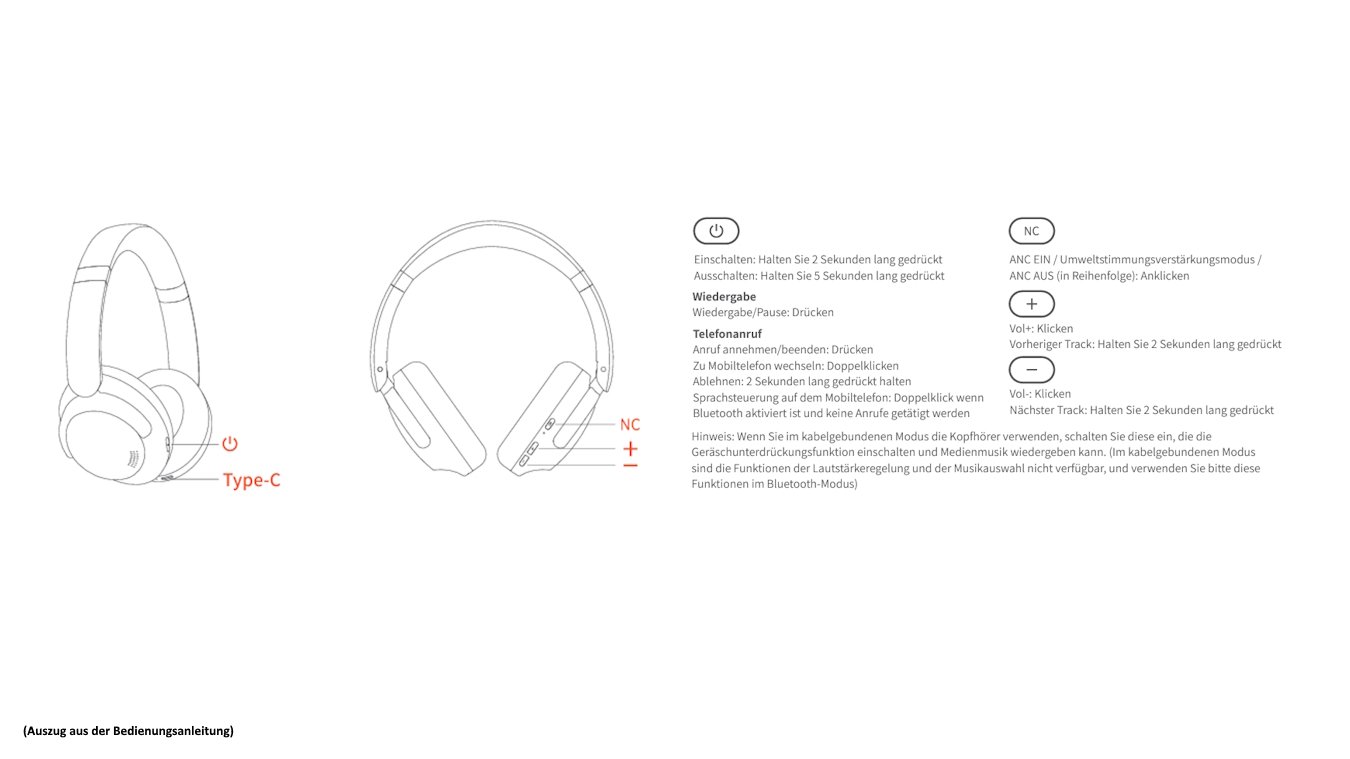 Die Bedienelemente in Form von Tasten befinden sich allesamt auf der rechten Ohrmuschel. Die Grundfunktionen der vier Tasten dienen dem Ein-/Ausschalten, Multifunktion und dem Einstellen der Lautstärke. Im Einzelnen verfügen die Tasten aber noch über weitere Funktionen. Zwischen den Lautstärketasten und der Multifunktionstaste ist eine LED untergebracht, welche durch eine bestimmte Leuchtfarbe den aktuellen Status anzeigt. Zudem befindet sich auf der rechten Seite der Anschluss zum kabelgebundenen Betrieb. Auf der linken Seite finden wir den USB-Typ-C-Anschluss zum Laden des Kopfhörers.