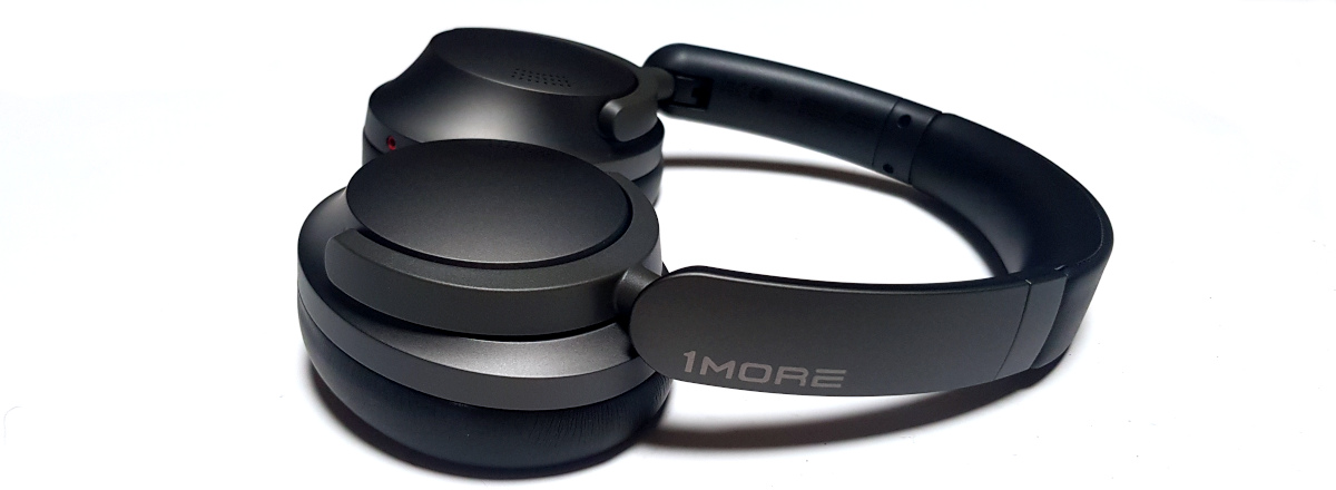 Die Auflagefläche des Kopfbügels ist komplett mit schwarzem Kunstleder bezogen. Auf der Oberseite ist mittig ein 1MORE Logo eingeprägt. Damit er auch bequem auf dem Kopf sitzt, ist der untere Bereich mit einem breiten Streifen aus Memory Foam gepolstert. An den Seiten wird das Leder jeweils durch eine verschraubte Plastikklammer eingefasst.