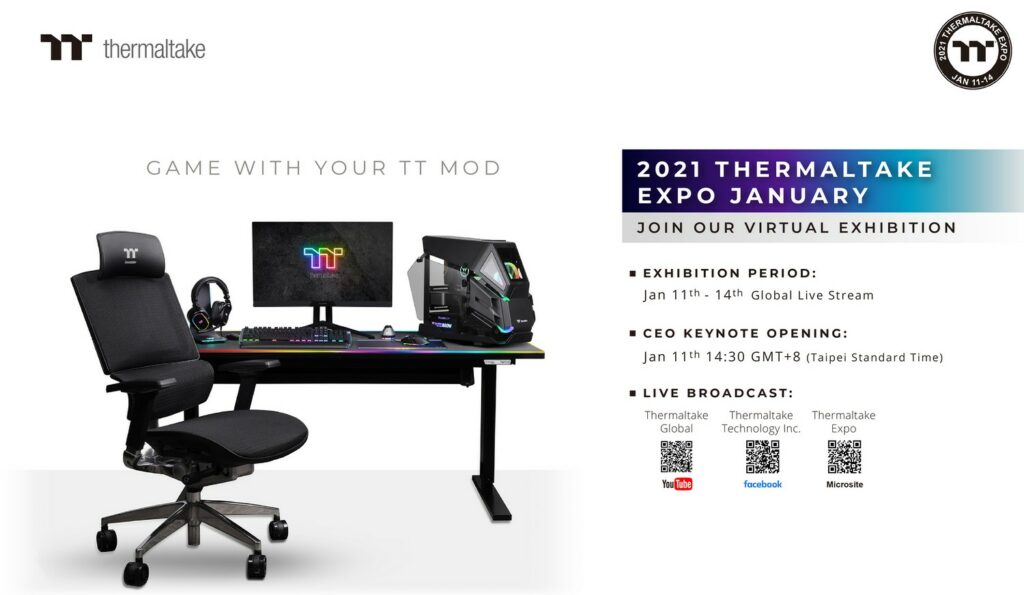 Taipei, Taiwan-December 28th, 2020 - Thermaltake, the leading premium brand of PC DIY components for Cooling, Gaming Gear and Enthusiast Memory solutions, will be holding the 2021 Thermaltake Expo January Virtual Exhibition from January 11th to 14th. Around 30 amazing products will be presented during the event. New product launches will be scheduled each day via live stream broadcasts on the Thermaltake Facebook Page, Thermaltake Global YouTube Channel, and Event Microsite. Besides attractive rich content, our global audience can join our scheduled virtual exhibit tours and participate in our live giveaways.