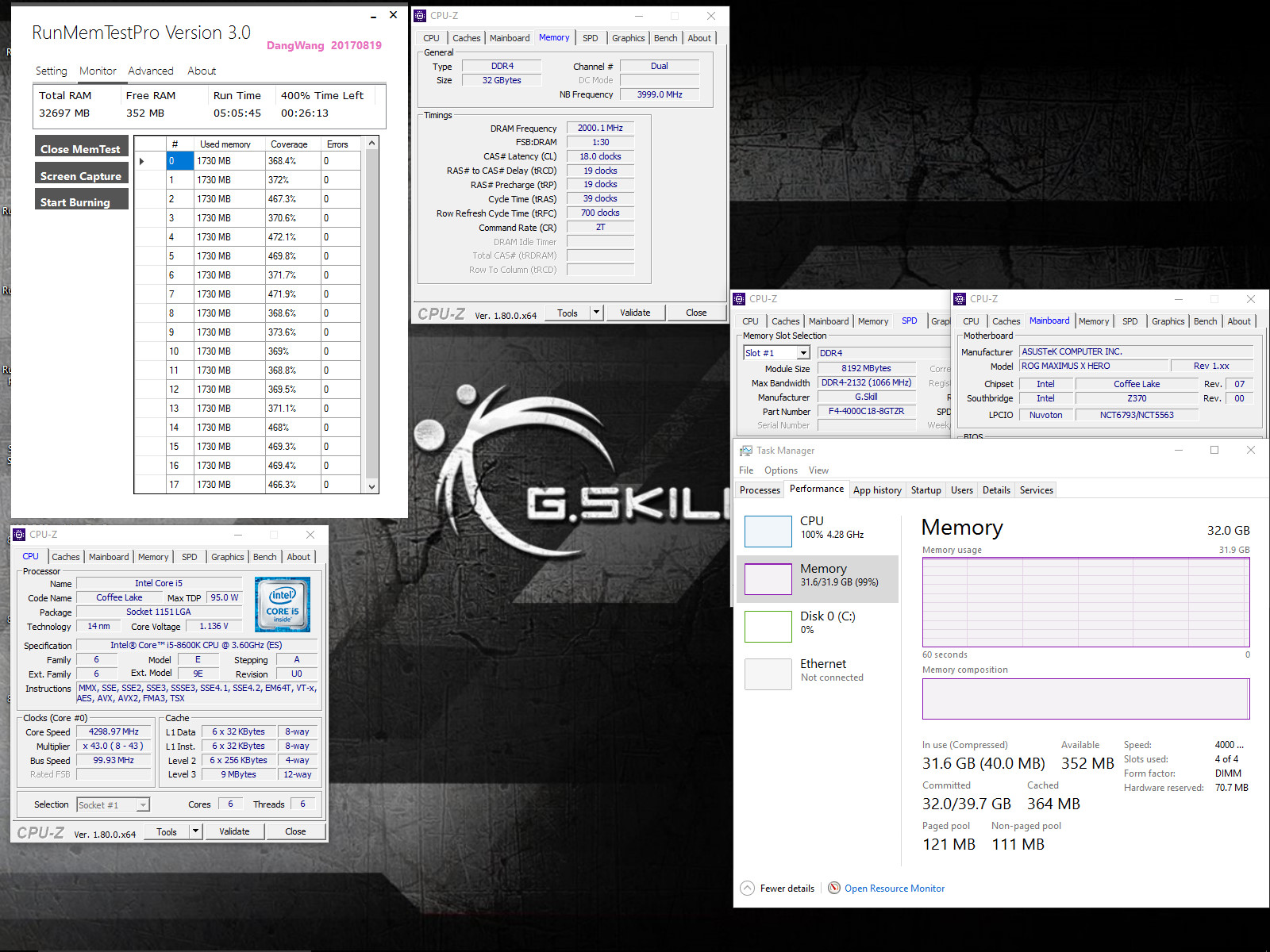 Trident Z Arbeitsspeicher werden mit Ultra-Hochleistungs-Samsung B-die DDR4 ICs hergestellt. G.SKILL versucht immer die schnellsten Memory-Kits, direkt nach dem Launch neuer Plattformen, auf dem Markt zu integrieren. Dabei werden immer bessere und höhere Speicher-Spezifikationen angestrebt, um die Leistung zu maximieren. Dieses Mal, gepaart mit den neuen 8. Gen. Intel Core Prozessoren, wird der G.SKILL Trident Z RGB aus einem Blister bestehend mit 4 mal 8 GB mit 4000 MHz und CL18-19-19-39 bei 1,35 V getestet. Das Bild zeigt das neue RGB-G.SKILL Trident Z RGB-Kit auf dem ASUS ROB MAXIMUS X HERO (WI-FI-AC) und dem Intel Core i5-8600K im Testdurchlauf.