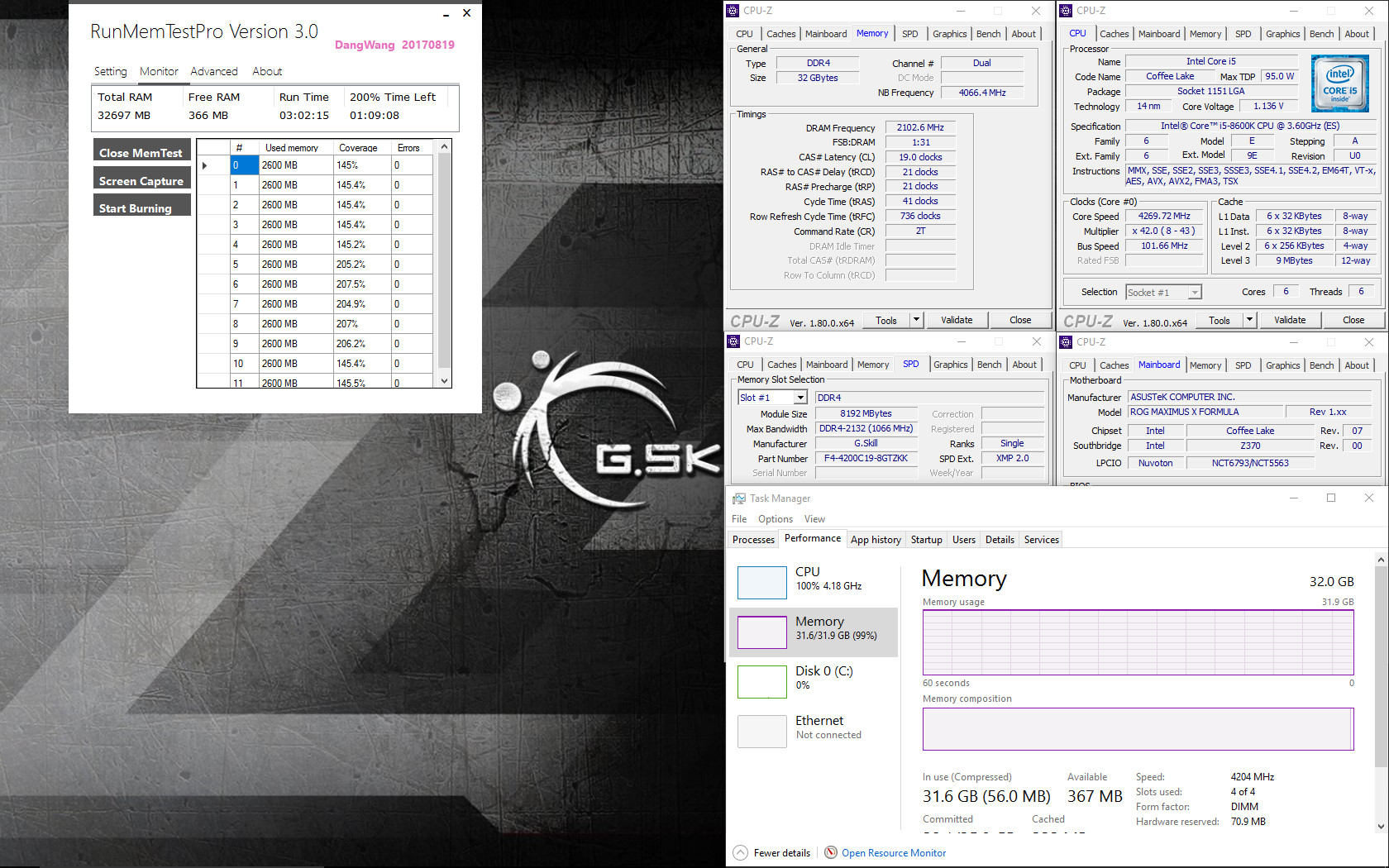 Das Beste aus beiden Welten: Der DDR4-4200 MHz 32 GB Arbeitsspeicher eignet sich am besten für User mit mittleren Workstations und Content Creation PCs. Mit 1,4 V und CL 19-21-21-41 in einem 32 GB Kit, bekommt man hohen Takt und hohe Kapazität in einem Blister geliefert. Zu sehen im Test mit einem ASUS ROG AXIMUS FORMULA X und einem Intel Core i5-8600K.
