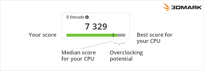 Die grünen Balken auf der Seite mit den Ergebnissen des 3DMark-CPU-Profils zeigen, wie die Ergebnisse im Vergleich zu den besten Ergebnissen für diese CPU abschneiden. Je länger der grüne Balken, desto näher liegt die Punktzahl am besten Ergebnis für das CPU-Modell. Der durch den Marker angezeigte Medianwert zeigt das Leistungsniveau an, das für die CPU erwartet wird. Wenn die Punktzahl unter dem Median liegt, kann dies auf ein Problem mit der Kühlung oder auf Hintergrundprozesse hinweisen. Dann sollte das Hardwareüberwachungsdiagramm überprüft werden, um zu sehen, wie sich die CPU-Temperatur während des Laufs verändert hat. Der Abstand von der Medianmarkierung bis zum Ende des Balkens repräsentiert das Übertaktungspotential der CPU. Für Übertakter bietet das 3DMark-CPU-Profil mehr Möglichkeiten, die Auswirkungen der Übertaktung zu messen und um die höchsten Punktzahlen zu konkurrieren!