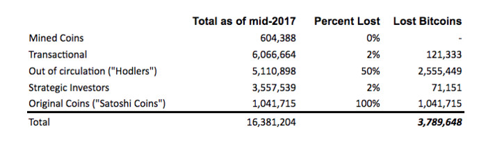 Eine neue Studie von Blockchain-Analysten Chainalisys sagt, dass die Menge an Bitcoins, die tatsächlich im System verloren geht, bei ungefähr 3,79 Millionen Münzen liegt. Das wäre heute ungefähr $ 20 Milliarden an Wert. Irgendwo in zufälligen Bits und Bytes auf der ganzen Welt verschwanden sie. Denken Sie daran, dass das gesamte Bitcoin-Angebot bei 21M Bitcoins liegt – das bedeutet, dass etwa 20% des gesamten möglichen Umlaufwerts dieser Währung bereits verloren sind. Ob diese Menge an verlorenem Bitcoin bereits in der Gesamt-Bitcoin-Preisgestaltung enthalten ist oder nicht, bleibt abzuwarten (denken Sie daran, dass ein niedrigeres Angebot normalerweise zu einer höheren Nachfrage und einem entsprechend höheren Wert führt).
