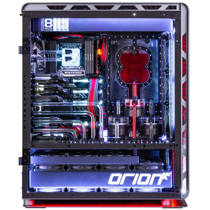 Sowohl das primäre als auch das sekundäre System, aus denen sich der Orion X2 zusammensetzt, sind übertaktet und präzise abgestimmt, um das Maximum herauszuholen, das jedes Stück Hardware liefern kann. Um sicherzustellen, dass beide Systeme kühl, stabil und leise laufen, bietet die Wasserkühlung voneinander unabhängige Kühlkreisläufe – mit Kontrolle über die Lüfter und Pumpen. Die Kühlflüssigkeit fließt durch mehrere Ausgleichsbehälter auf verschiedenen Ebenen, die beleuchtet die komplizierte Konstruktion offenbart.