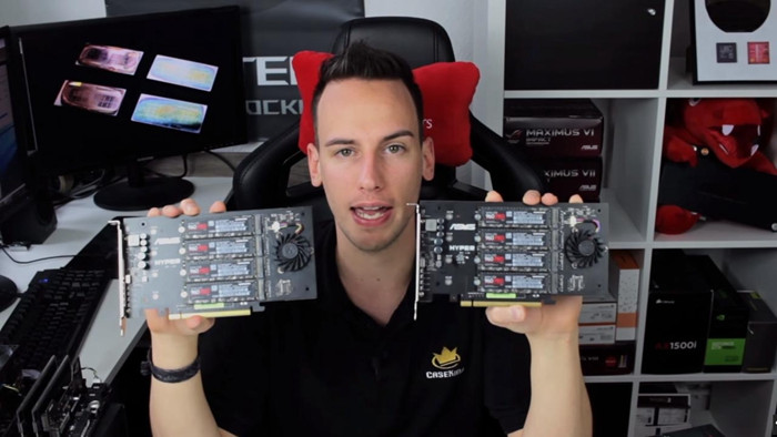 Das Video ist mittlerweile nicht mehr verfügbar, jedoch hat die Seite HardOCP einige Screenshots dazu veröffentlicht. Darin ist die Nutzung eines Asus X399 Boards zu erkennen (vermutlich ROG Zenith Extreme). Mit Hilfe von zwei Asus Hyper M.2 x16 Karten bringt Roman die acht Samsung 960 PRO/EVO-Karten auf dem Board unter und misst in IOmeter phantastische Performancewerte von 28375.84 MB/s. Das ist schon fast auf dem Niveau von DDR4-RAM und das auf permanentem Speicher!