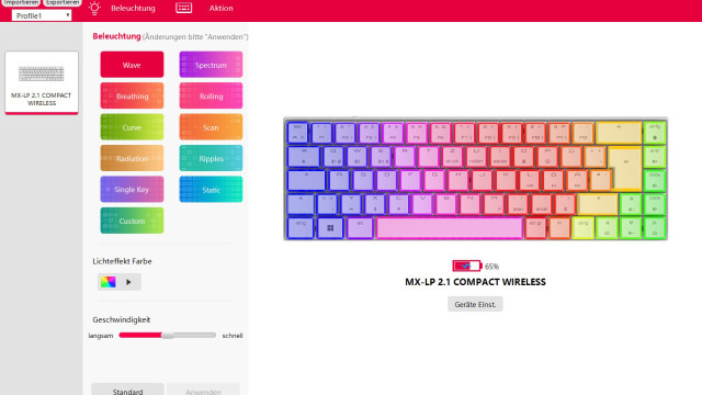 Ist die Cherry MX-LP 2.1 schon im ausgeschalteten Zustand ein schönes Stück Technik, so verstärkt sich dieser Eindruck beim Einschalten der Beleuchtung noch einmal. Da es sich hier um ein recht helles Material handelt, wirkt die Beleuchtung noch mal um einiges kräftiger, als dies bei dunklen Tastaturen der Fall ist. Die Beschriftung ist jetzt noch einmal etwas besser ablesbar und die Tastenkappen wirken, als wenn diese über dem Gehäuse schweben. Die Beleuchtung lässt sich auf jeder Taste beliebig anders konfigurieren, es sind aber auch schon sehr viele Effekte zur Auswahl vorhanden.