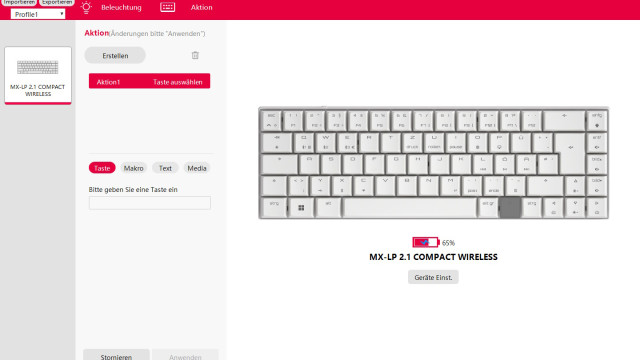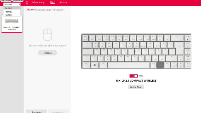 Cherry bietet auch eine Software zur Tastatur an, dabei handelt es sich um die „CHERRY Utility“ Software. Diese beinhaltet Möglichkeiten der Individualisierung von Beleuchtung, Tastenbelegung und dem Erstellen von Makros. Zudem wird uns in der Übersicht der Software auch der aktuelle Ladezustand und der Status des Ladens angezeigt. Die Software ist übersichtlich gestaltet und einfach zu bedienen. Die Software nimmt im installierten Zustand rund 66 MB Speicherplatz ein. Viele Funktionen lassen sich aber auch ohne Software über Tastenkombinationen erledigen.