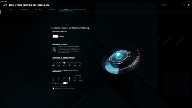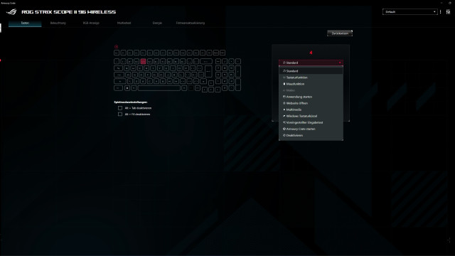 ASUS setzt bei allen Peripheriegeräten auf die Software „Armoury Crate“. Diese bietet in gewohnter Weise zahlreiche Einstellungsmöglichkeiten. So kann hier jeder Taste eine andere oder zusätzliche Funktion zugewiesen werden, die in Kombination mit der FN-Taste genutzt werden kann. Auch der vierte Modus der Multifunktionstaste oben rechts, die mit Hilfe des Multiwheels bis zu drei benutzerdefinierten Aktionen ausführen kann, lässt sich hier anpassen.
