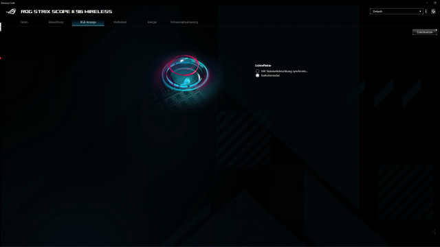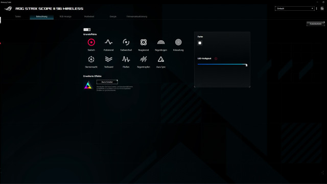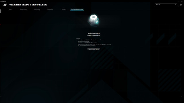 Bei der Beleuchtung bieten sich dem Nutzer ganze 11 Grundeffekte, die jeweils angepasst werden können. Pulsierende Farben, Regenbogen und statische Beleuchtung gehören dabei zum guten Ton. Möglich ist auch, jede Taste einzeln anzusteuern und anders zu beleuchten. Im letzten Reiter kann die Firmware mit wenigen Klicks aktualisiert werden, was hervorragend funktioniert hat. Die Tastatur lässt sich via Aura Sync mit dem restlichen Setup synchronisieren, vorausgesetzt man nutzt weitere Aura Sync fähige Geräte. Eine Auswahlmöglichkeit, was genau installiert wird, halten wir hier definitiv für angebracht, denn die Software kommt von Haus aus mit sehr vielen Funktionen, die für den ein oder anderen eher störend wirken kann.