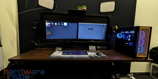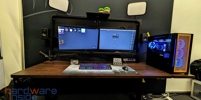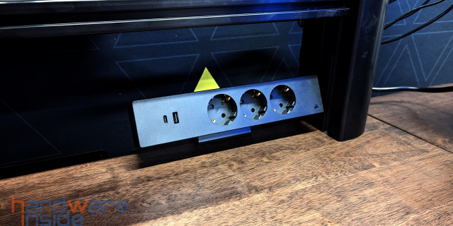 Den Tisch wird es in drei Varianten geben, einmal fest ohne Verstellung, einmal mit elektrischer Höhenverstellung und dann noch mal die Version mit dem Überbau. Die letzte Version richtet sich aber vornehmlich an Streamer. An diese Lochwand kann man seine Sachen befestigen, die sonst rumliegen und außerdem auch Kameras und Beleuchtung. Auch wichtig ist, dass dieses Teil komplett mit einer verdeckten Stromversorgung nebst USB Ladegerät, Anschlüsse, Mehrfachsteckdose und zwei Monitorhaltern ausgestattet ist.