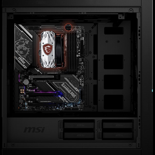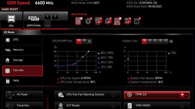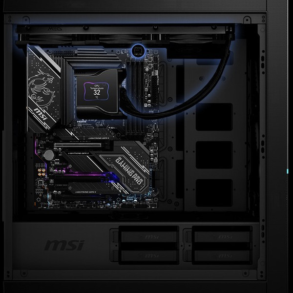 Bei der Lüftersteuerung schafft wieder die Steueroberfläche im BIOS Abhilfe. Mit der einfachen Grafikoberfläche können bis zu vier Temperaturziele gewählt werden, bei denen die Lüftergeschwindigkeiten automatisch angepasst werden. Weiterhin ist die Lüftersteuerung auch softwaretechnisch im MSI-Center möglich. Dabei bietet die FROZR AI Cooling Engine eine automatische Kühlung durch Messungen der Temperatur an verschiedenen Stellen im Gehäuse an. So erkennt das System automatisch in welchem Modus die Lüfter betrieben werden und sorgt für eine optimierte Abstimmung der Lüftergeschwindigkeiten. Durch eine entstehende Hysterese drehen die Lüfter gleichmäßig, sodass das System immer leise bleibt. Die Lösung durch die Wasserkühlung in Form einer AIO ist ein spezieller Pin montiert, der bis zu 3 Ampere ermöglicht, um die volle Kontrolle über die Wasserpumpe zu erhalten. Hierbei ist volle Unterstützung durch die Marken MSI, Bitspower, Cooler Master, Corsair, ekwb und Thermaltake versprochen.