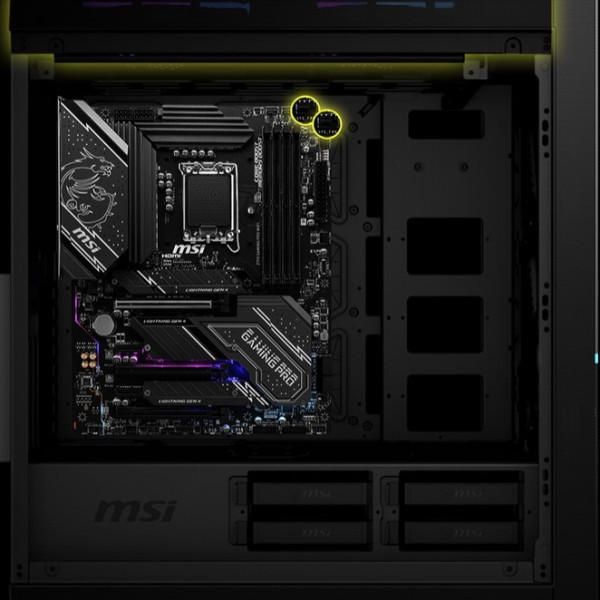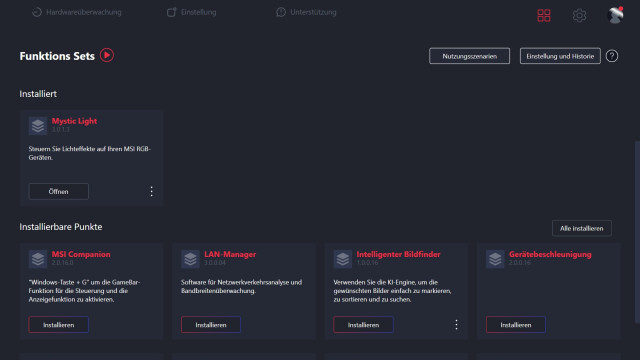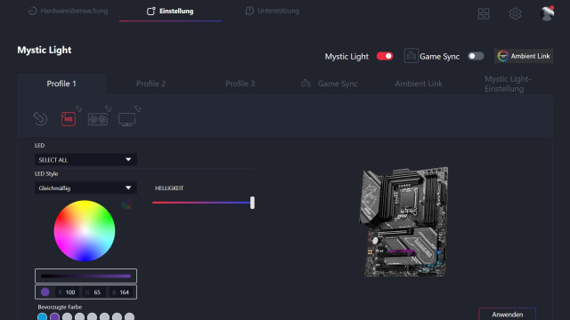 Die Beleuchtung kann über das MSI-Center im Mystic-Light angepasst werden. Mit verschiedenen Profilen und Voreinstellungen wie beispielsweise dem Ambient-Link, kann das ganze System gesteuert werden. Auch in Verbindung mit Drittanbieter-Software wie Armoury Crate oder ICUE können die Softwarelösung mit den richtigen Einstellungen koexistieren.