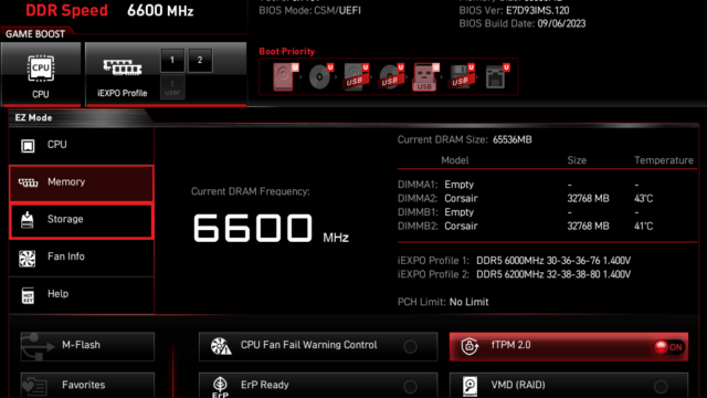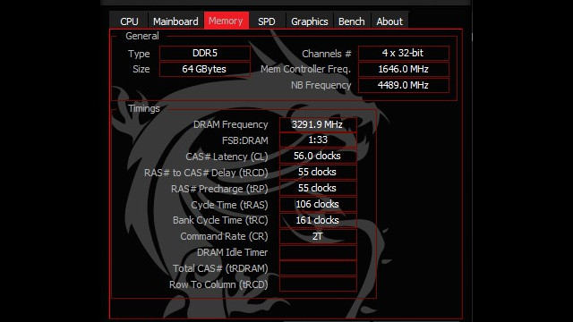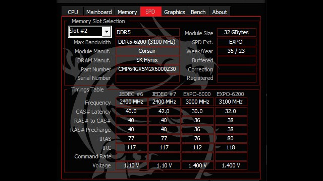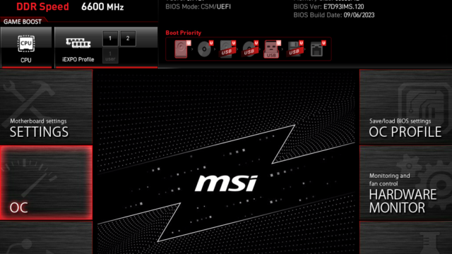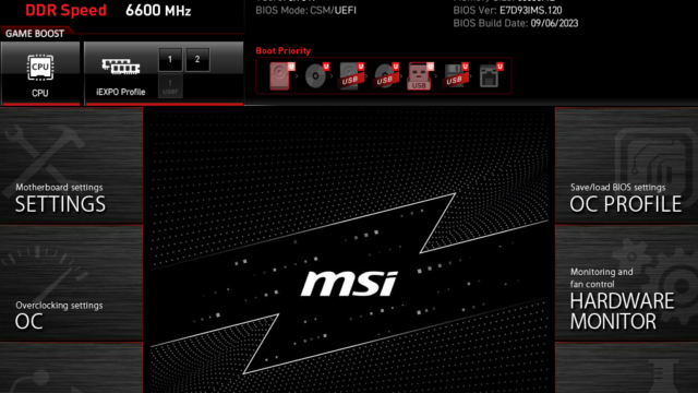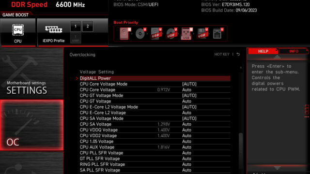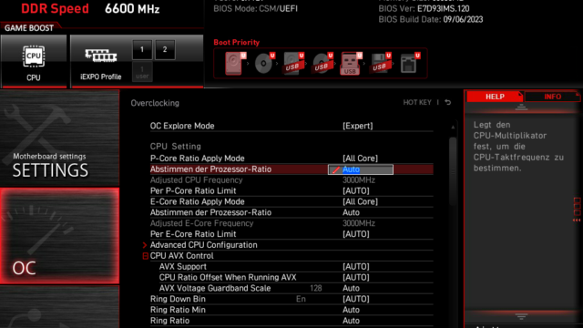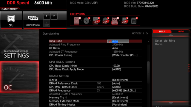 In der Praxis unterstützt das MSI Z790 GAMING PRO WIFI Intel Core Pentium, Gold und Celeron Prozessoren der 12. und 13. Generation für den LGA 1700 Sockel. Der DDR5-Speicher wird bis zu einer Taktrate von 7.200 MHz im Overclocking unterstützt, wobei wir den CORSAIR DOMINATOR TITANIUM mit einer Taktrate von 6.600 MHz ausreizen. Im Vergleich dazu unterstützte die Z690 Reihe nur bis zu 6.400 MHz. Obwohl die RAM-Speicher für AMD ausgelegt sind, kann dieser auch problemlos auf einer Intel-Plattform betrieben werden. Hierbei sollten die RAM-Einstellungen im BIOS aber von Hand durchgeführt werden, was nur für erfahrene Benutzer zu empfehlen ist. Das BIOS bietet sehr viele Anpassungsmöglichkeiten, die hauptsächlich Enthusiasten ansprechen. Für Durchschnittsverbraucher ist das Angebot an Einstellungen mehr als ausreichend. Am Rande sei erwähnt, dass auch hier ein Übertakten des Prozessors sowie Arbeitsspeichers möglich ist. Die Einstellungen der Taktraten und Spannungen und Ströme sind für Nutzer, die genau wissen, was sie tun. Mit dem aktuellen BIOS-Version 7D93v12 wollen wir uns weiterhin anschauen, wie das System auf ein Overclocking des RAM-Speichers reagiert.