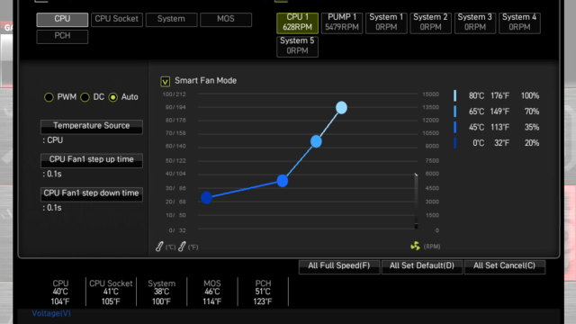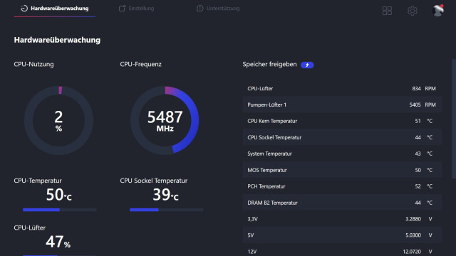 Mit der True-Color-Funktion können die Farben des Displays an die eigenen Bedürfnisse angepasst werden. Im User-Scenario können wir die Leistungsszenarien mit einem Klick von Extreme Performance über Balanced und Silent bis zu Custom-Einstellungen auswählen. Im Hardware Monitoring finden wir alle wichtigen und aktuellen Daten des Systems im Überblick. Hier werden die CPU-Nutzung, Taktfrequenz, Temperaturen und Spannungen angezeigt. Diese Einstellungen können im Profile Setting nach eigenen Belieben eingestellt werden, was aber eher für erfahrene Benutzer ausgelegt ist. Mit der System Diagnose kann dabei der Speicher im System überwacht werden.