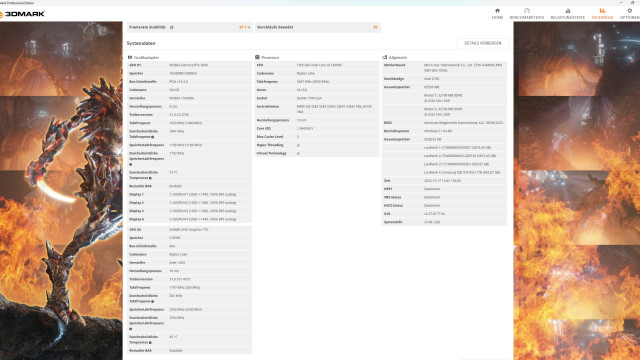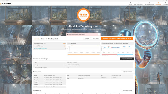Den ersten Test mit Time Spy hatten wir nicht bestanden, da noch einige Programme im Hintergrund liefen. Anschließend haben wir sämtliche Programme im Hintergrund deaktiviert und den Test mit 20 Durchläufen erneut gestartet. So konnten wir den Belastungstest mit 98,6 % bestehen.