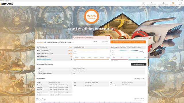 Auch das Solar Bay Unlimited liefert uns das Ergebnis von einem bestandenen Belastungstest mit 97,1 %. Hierbei sind Framerate, Temperatur und Frequenz in den Diagrammen abgebildet und nachzuvollziehen.