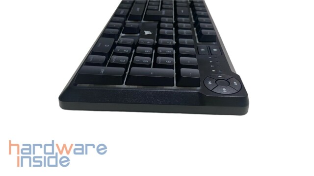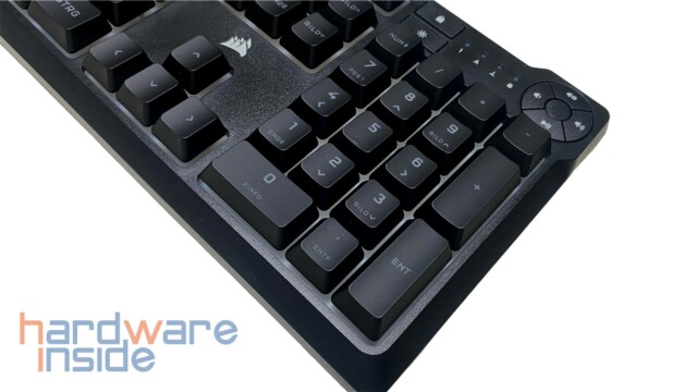 Der obere Teil des Gehäuses besteht komplett aus Kunststoff und besitzt eine leicht angeraute Oberfläche. Die Vorderseite wurde abgeschrägt und ein CORSAIR-Logo ist über den Pfeiltasten ebenfalls vorhanden. In der rechten oberen Ecke über dem Nummernblock sind die Media-Tasten neben den Status-LEDs als flache Tasten eingelassen. Auch die Windows-Sperrtaste und eine Taste zur Einstellung der Helligkeit sind hier ebenfalls untergebracht.