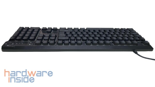 Das ISO-Layout besitzt ein modernes Design mit leicht gewölbten Tasten. Alle Tasten sind durchscheinend. Unter den Tasten sind Rubber Dome-Switches verbaut, dabei handelt es sich um flexible Puffer aus Gummi. In der Mitte befindet sich ein Kontakt, der beim Betätigen ausgelöst wird. Durch den flexiblen Puffer wird die Taste nach dem Loslassen wieder in die Ausgangsposition gebracht. Im Gegensatz zu mechanischen Switches ist die Lebensdauer kürzer. Die Tasten sind in einzelne Bereiche mit einem milchig weißen Untergrund unterteilt. Dieser wird im Betrieb von LEDs ausgeleuchtet, zusätzlich schützt der Untergrund die Tasten.