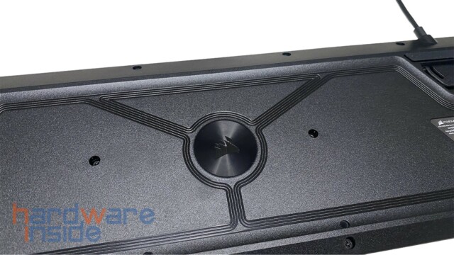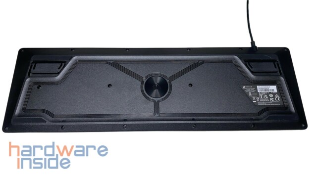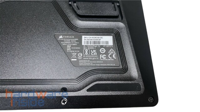 Der untere Teil des Gehäuses wurde ebenfalls aus Kunststoff gefertigt. Sie wirkt mit den umlaufenden Linien und dem mittig, auf einer Metallplatte, platzierten CORSAIR-Logo optisch sehr ansprechend. In allen vier Ecken sind Füße in Form von länglichen Gummis angebracht, die der K55 CORE einen sicheren Stand bieten sollen. In der rechten unteren Ecke ist noch ein Typenschild aufgeklebt, auf dem unter anderem die Versorgungsspannung, der Strom und auch die Seriennummer aufgedruckt sind.