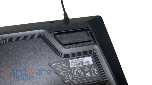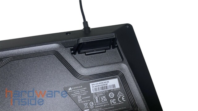 Um den Aufstellwinkel der K55 CORE verändern zu können, sind oben an der rechten und linken Seite ausklappbare Füße verbaut. Diese lassen sich in einer Position einrasten und sind zusätzlich ebenfalls mit Gummifüßen versehen, um ein Verrutschen zu verhindern. Das gummierte Anschlusskabel ist fest mit dem Tastaturgehäuse verbunden. Hier hätten wir uns ein abnehmbares Kabel für mehr Flexibilität gewünscht. Mit zwei Metern ist es aber ausreichend lang.