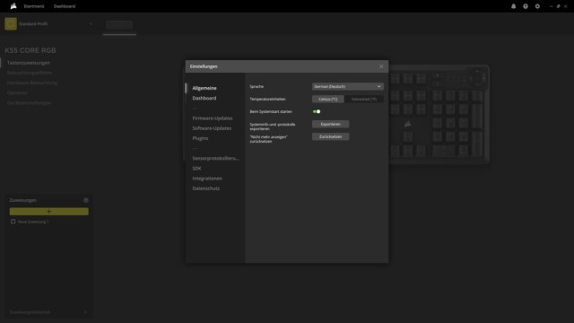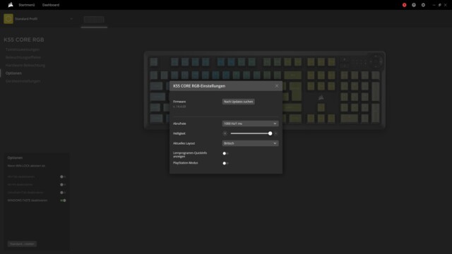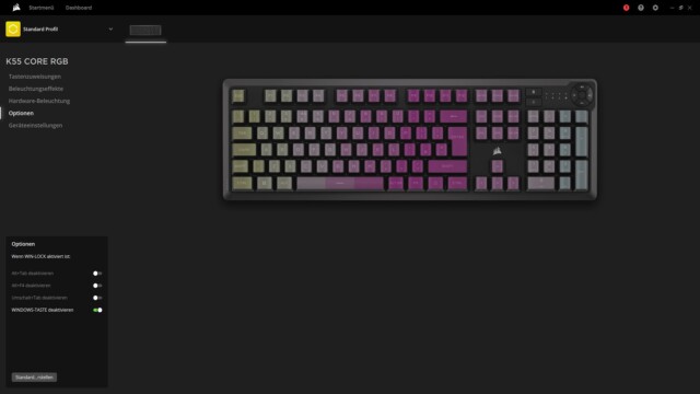 Für die Inbetriebnahme wird die K55 CORE lediglich mit dem USB-Kabel an unser Testsystem angeschlossen. Windows erkennt die Tastatur automatisch und installiert die nötigen Treiber. Zur weiteren Konfiguration wird die hauseigene iCUE-Software benötigt. Diese ist bereits auf unserem System installiert.