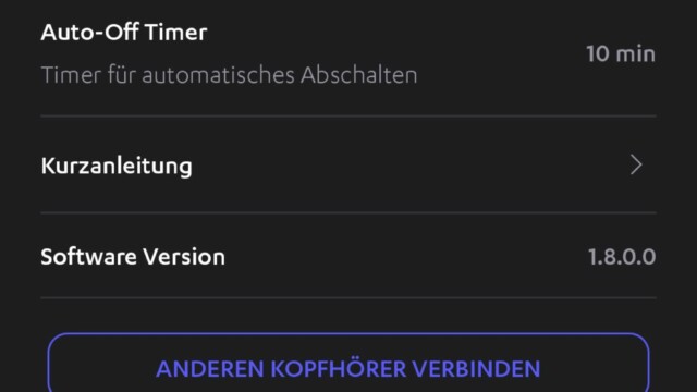 Sobald die App eingerichtet ist, zeigt sie die AIRY TWS 2 mittig im Bildschirm auf einer weißen Oberfläche an. Im oberen Bereich sehen wir die Modellbezeichnung und den Ladestatus der einzelnen Earbuds. Im unteren Bereich gelangen wir zur Geräuschkontrolle über die wir „Aus“, „ANC“ und „Transparenz“ auswählen können. Im gleichen Menü wird in kurzen Worten beschrieben, welche Funktion gerade aktiv ist. Weiterhin befindet sich am oberen rechten Rand ein Zahnrad für die Einstellungen der Kopfhörer und der App selbst. Bei den Kopfhörern können wir die Farbe festlegen, die Multipoint-Verbindung aktivieren, einen Auto-Off-Timer festsetzen, die Kurzanleitung abrufen und die Softwareversion einsehen.