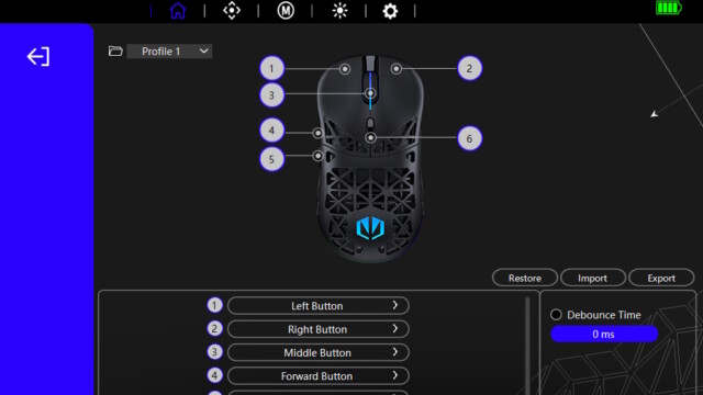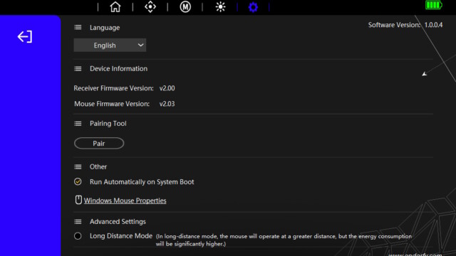 Zur ENDORFY LIV Plus Wireless Gaming Maus gibt es auch eine entsprechende Software, erst mit dieser lassen sich alle Funktionen der Maus nutzen. Die Installationsdatei ist nur knapp 5 MB groß und nimmt auf der Festplatte im installierten Zustand 17,4 MB Speicher ein. Die Software ist übersichtlich in fünf Abschnitte unterteilt. Im ersten Abschnitt können wir alle sechs Tasten frei belegen. Im nächsten Abschnitt dreht sich alles um den Sensor, so können hier die Stufen der Auflösung, Pollingrate sowie weitere Einstellungen tätigen. Im dritten Abschnitt können wir Makros erstellen und abspeichern – die erstellten Makros lassen sich später auf die Tasten der Maus legen. Im darauffolgenden Schritt haben wir eine ganze Reihe an Möglichkeiten bezüglich der Beleuchtung der Maus. Im letzten Abschnitt finden wir überwiegend Informationen. Interessant ist hier der „Long Distance Mode“, durch diesen wird die Funkreichweite erhöht, was zulasten der Akkulaufzeit geht.