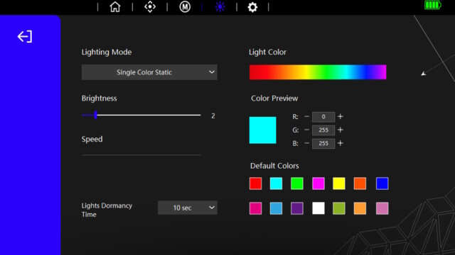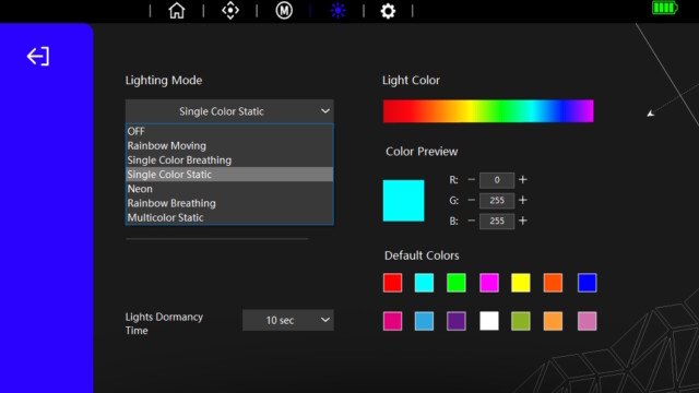 Die Maus selbst verfügt an der hinteren Kante unten über ein Element, welches durch mehrere RGB-LEDs ausgeleuchtet wird. Durch die Software lassen sich, wie im Video zu sehen ist, eine Vielzahl an Effekten und Farben einstellen. Die Helligkeit sowie die Geschwindigkeit der Effekte lassen sich auch noch regulieren.