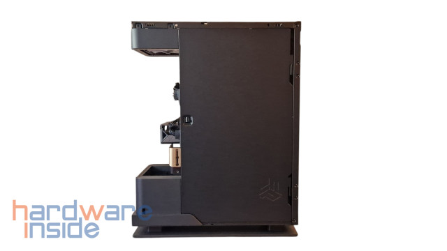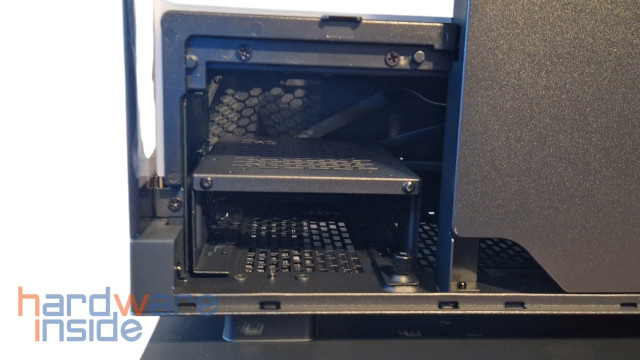 Die Laufwerkspositionierungen sind gut gewählt, so finden sich bis zu fünf 2,5″ SSDs oder zwei 3,5″ HDDs gleichzeitig ihren Platz. Zum einen verbirgt sich unterhalb, nachdem man die Klappe entfernt hat, ein Festplattenkäfig, in dem 2x 3,5-Zoll-HDD-Laufwerke oder 1x 3,5-Zoll-HDD und 2 x 2,5-Zoll-SSD-Laufwerke verbaut werden können. Zum anderen können hinter dem Mainboard -Tray, auf der seitlichen demontierbaren Halterung durch Lösen der Rändelschraube gleich 3x 2,5″ SDDs installiert werden.