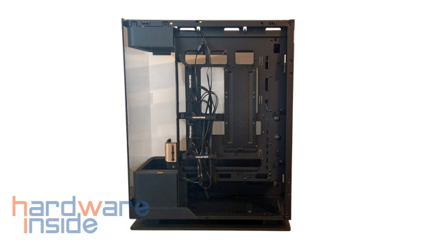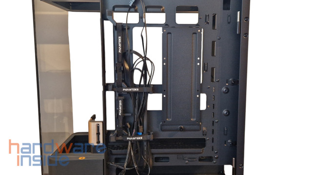 Eine große Tür auf der rechten Seite, die sich einfach öffnen und auch entnehmen lässt, soll die dortigen Kabel verbergen. Durch die vier seitens Phanteks angebrachten Klettbänder sowie die zahlreichen Ösen für das evtl. Anbringen von Kabelbindern (im Lieferumfang enthalten) ist das Verlegen von Kabeln ein Kinderspiel und sorgt so für ein sauberes und stimmiges Gesamtbild.