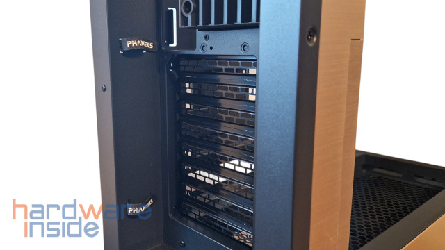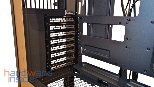Das EVOLV X2 bietet acht Erweiterungs-Slots, die durch Lösen der Schrauben seitlich entfernt werden können. Um die Schrauben der PCIe -Slots zu verdecken, kommt bei dem EVOLV X2 ein PCIe-Cover zum Einsatz, welches einfach entnommen werden kann. So entsteht ein nahtloser Übergang im inneren des Gehäuses.