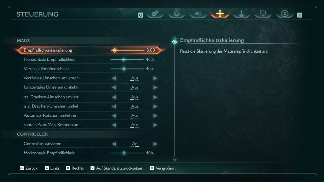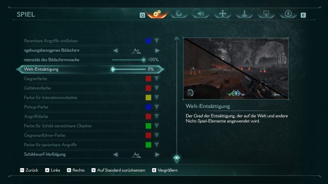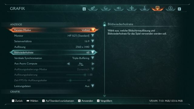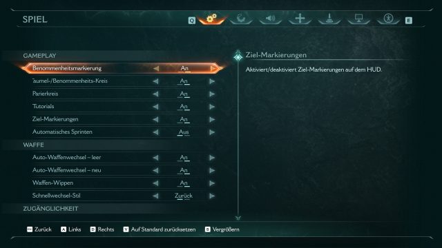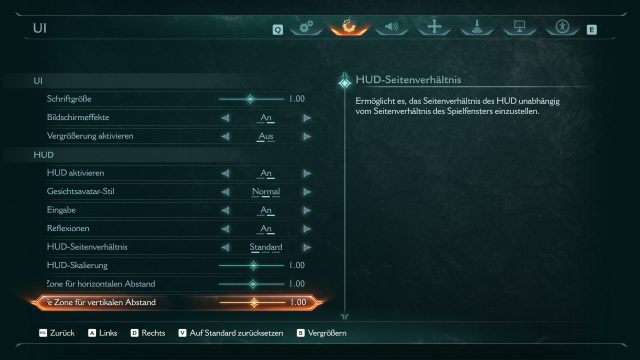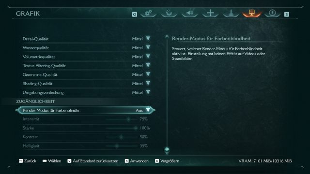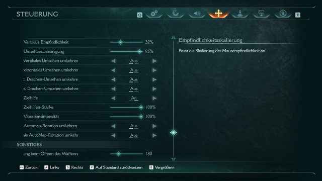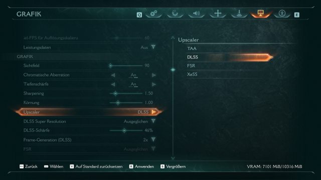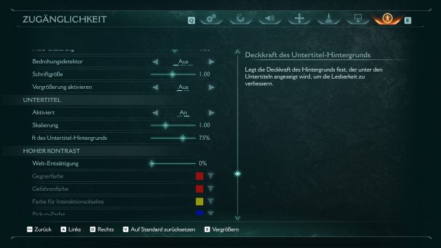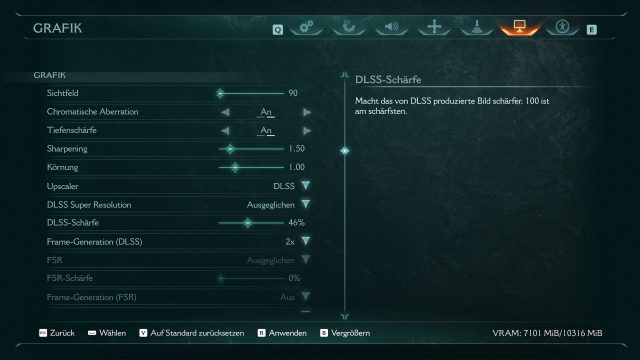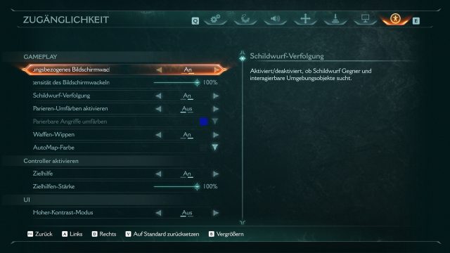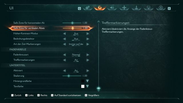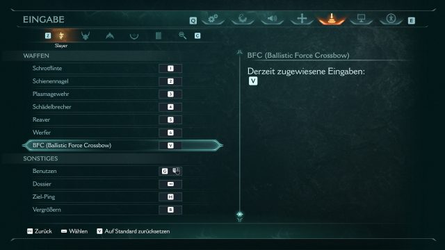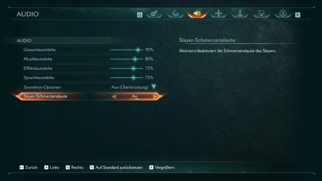 Um das Spiel dem eigenen System bzw. den eigenen Bedürfnissen anzupassen, gibt es ein recht umfangreiches Menü mit sieben verschiedenen Kategorien, in denen sich vielerlei Einstellungen vornehmen lassen. So lassen sich in den allgemeinen Einstellungen unter anderem verschiedene Gameplay-Funktionen wie Tutorials, Zielmarkierungen oder das Waffenwippen an- und abschalten. Gleiches gilt für das UI, hier können alle HUD-Einstellungen angepasst werden. Unter Audio werden die Lautstärken von der Musik, den Effekten oder auch die Sprachlautstärke sowie die Slayer-Schmerzlaute angepasst. Der Menüpunkt Steuerung befasst sich z. B. mit der Skalierung der Mausempfindlichkeit, der Invertierung der Steuerung, der Vibrationsintensität und Zielhilfe, falls notwendig. Unter dem Reiter „Eingabe“ lassen sich die Tastenbelegungen den eigenen Wünschen anpassen. Auch die Grafikeinstellungen sind gewohnt umfangreich, so besteht die Möglichkeit, die Bildwiederholrate und die vertikale Synchronisation an- und auszuschalten. Ebenso wurden alle gängigen Upscaler integriert, um das Beste aus der Grafik herauszuholen. Unter dem letzten Menüpunkt „Zugänglichkeit“ sind die wichtigsten Funktionen zusammengefasst, um die Einstellungen schnell vornehmen zu können.