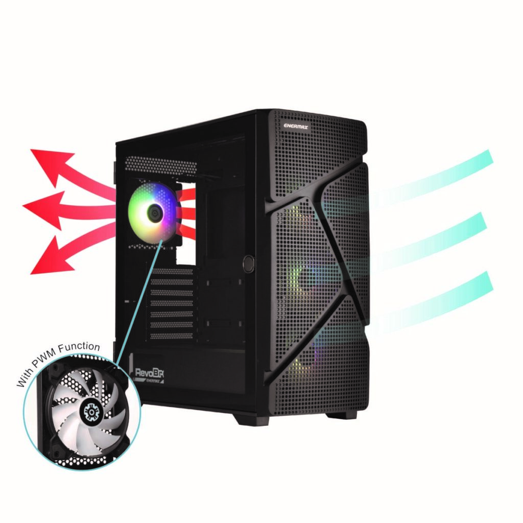 Das exklusive Mesh-Frontpanel Design mit ausgezeichneten Frischluftzufuhrfähigkeiten sorgt in Kombination mit dem Mesh-Top-Panel für effiziente Wärmeabfuhr, um Hitzestau im Gehäuse zu vermeiden. Der magnetisch abnehmbare Staubschutzfilter auf dem Top-Panel vermeidet das Eindringen von Krümel und Schmutz in das Gehäuse. Die vier vorinstallierten flüsterleisen PWM ARGB Lüfter versprechen hohe Kühlleistung mit optischer Finesse.