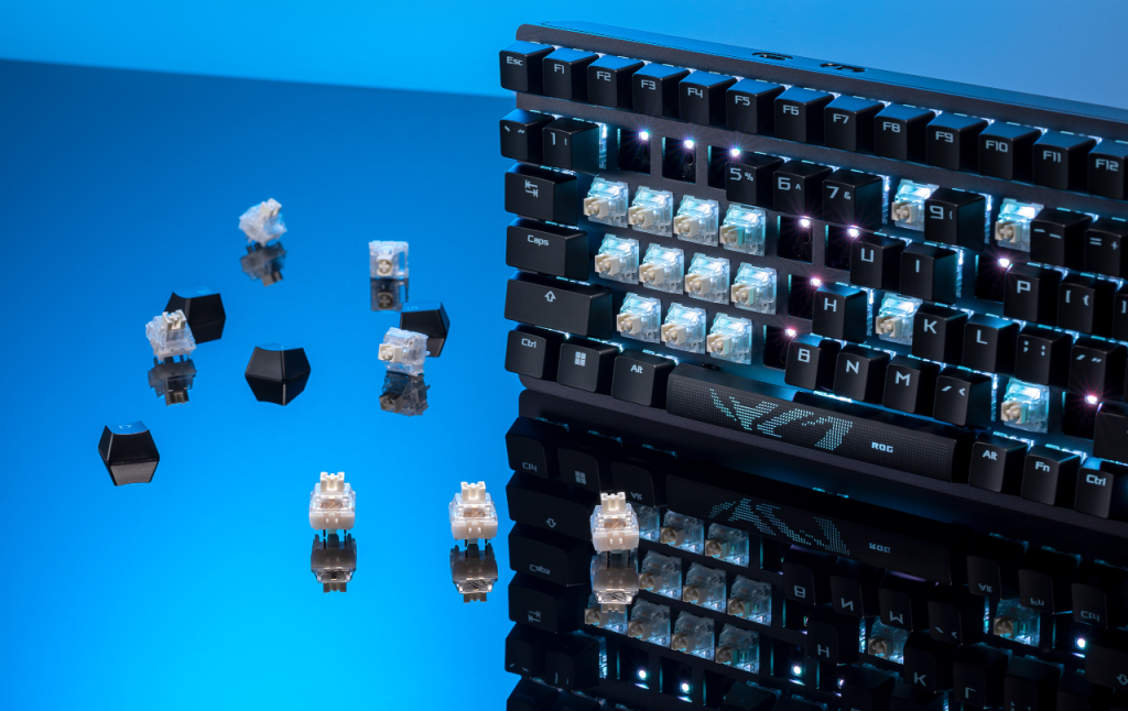 Die Strix Scope II 96 Wireless ist die erste 96%ige ROG-Tastatur mit mechanischen ROG NX Snow-Switches, die aus einem Kunststoffverbundwerkstoff bestehen und für einen ultraleichten Tastenanschlag sorgen. Das obere Gehäuse der Schalter besteht aus Polycarbonat (PC), während der Schaft und das untere Gehäuse aus einem Polyoxymethylen (POM)-Verbundwerkstoff bzw. POM gefertigt sind. Der ummantelte Stamm jedes Schalters erhöht die Stabilität der Tasten und verhindert das Eindringen von Staub. Die Switches werden im Werk speziell abgestimmt und gelubt, um einen stabilen Tastenanschlag und einen “thocky” (dumpfen) Klang zu gewährleisten. Außerdem sind die Schalter mit strapazierfähigen ROG PBT-Doubleshot-Tastenkappen ausgestattet, die ein erstklassiges Tastgefühl und Glanzbeständigkeit bieten. Auf Wunsch können Gamer ihre bevorzugten Switches austauschen und installieren, um ein individuelles Spielgefühl zu erhalten.