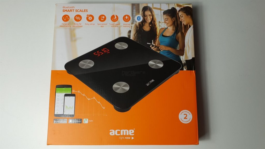 Verpackt wird die ACME SC101 SMART SCALES in einer orange-weißen Verpackung auf der die Körperwaage selbst und weitere Details abgebildet sind.