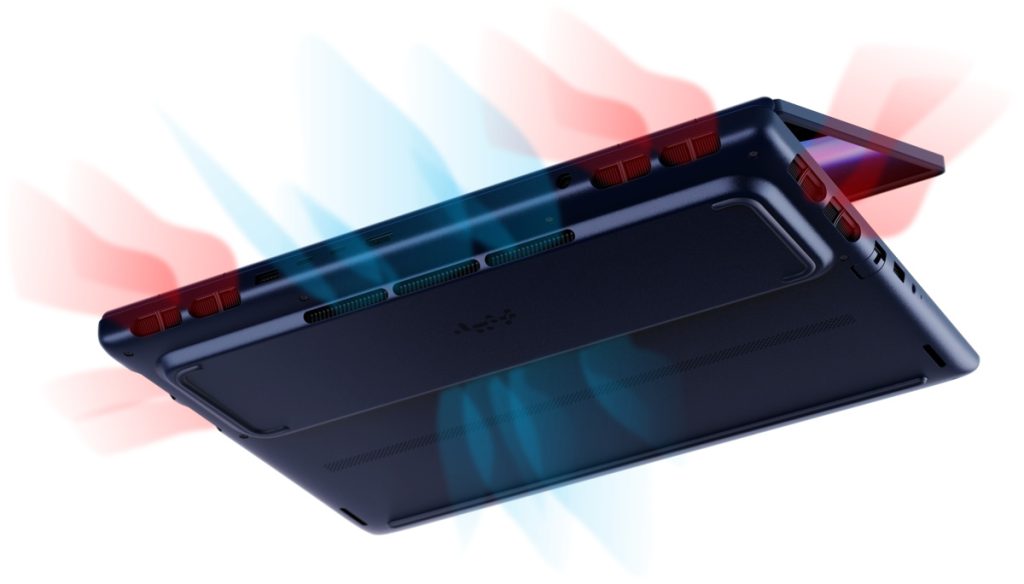 Für noch mehr Mobilität sorgt die optimierte Kühltechnologie der Notebooks. Die Geräte haben keine rückseitigen Kühlmodule, sind dadurch schlanker und lassen sich leichter in einen Rucksack stecken. Die Kühlmodule befinden sich stattdessen in einer Cryo-Chamber, die auf der Unterseite der Notebooks platziert ist und dort den Raum nutzt, an dem sich normalerweise ein hoher hinterer Fuß befindet. Sie maximiert die Luftzufuhr und leitet die Wärme über strategisch platzierte Lüftungsöffnungen effizient ab.